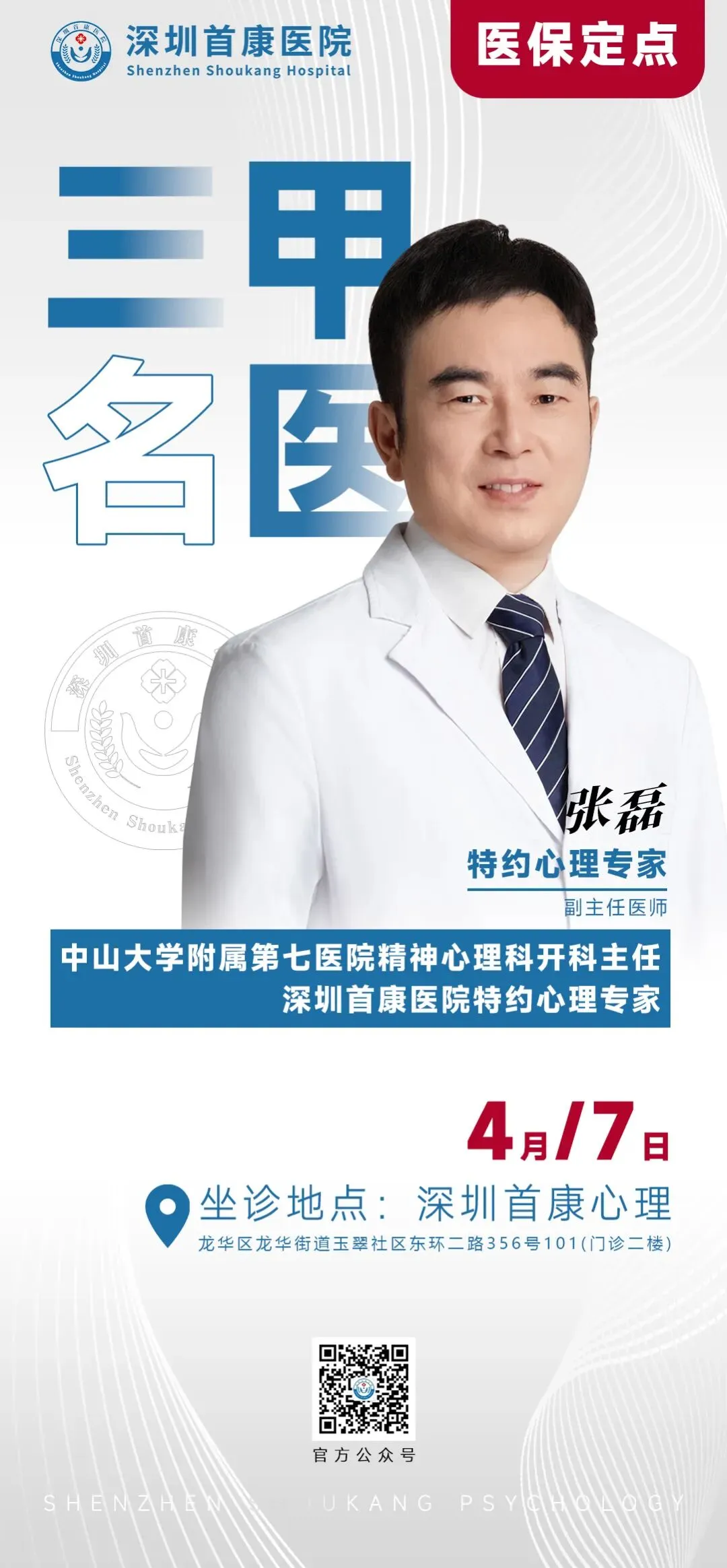 深圳首康心理科4月7日原深圳市康宁医院精神科主任刘文英主任出诊和中山大学附属第七医院精神心理科开科主任张磊出诊