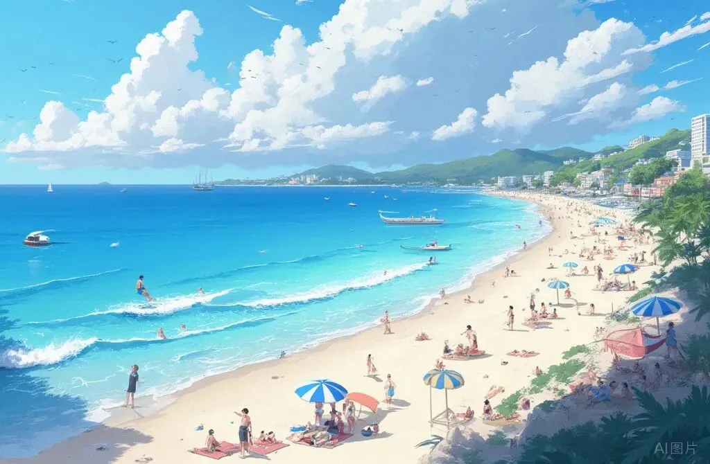 大梅沙背山面海的自然条件,把山景引向海边,把海景引向山体,是深圳山海连城的生动体现。步入海滩,首先扑入眼帘的是金色的沙滩、蔚蓝的海水、轻淡的白云、碧绿的山峦、点点的白帆,感觉到的是阵阵的椰风、飘香的花草、轻松的音乐,所有这些都显得立体动感。沙滩上满是鲜活画面——小孩追浪堆沙堡,笑声清脆,情侣牵手踏浪、举相机定格瞬间,三五好友打水仗、玩沙滩排球,遮阳伞下有人闲聊看海,动静交织,热闹却不嘈杂 。我们迫不及待地甩掉鞋子,欢快地走在沙滩上,细暖的金沙从趾缝滑落,浅浪一波波漫过脚踝又退去,带着微凉的清爽。白泡沫轻吻沙滩,哗哗声不绝,踩浪时的小雀跃真的很纯粹。海风带着咸湿的清新掠过发梢脖颈,混着阳光的暖不燥不寒,深呼吸都是大海的味道,瞬间吹散了都市的浮躁 。