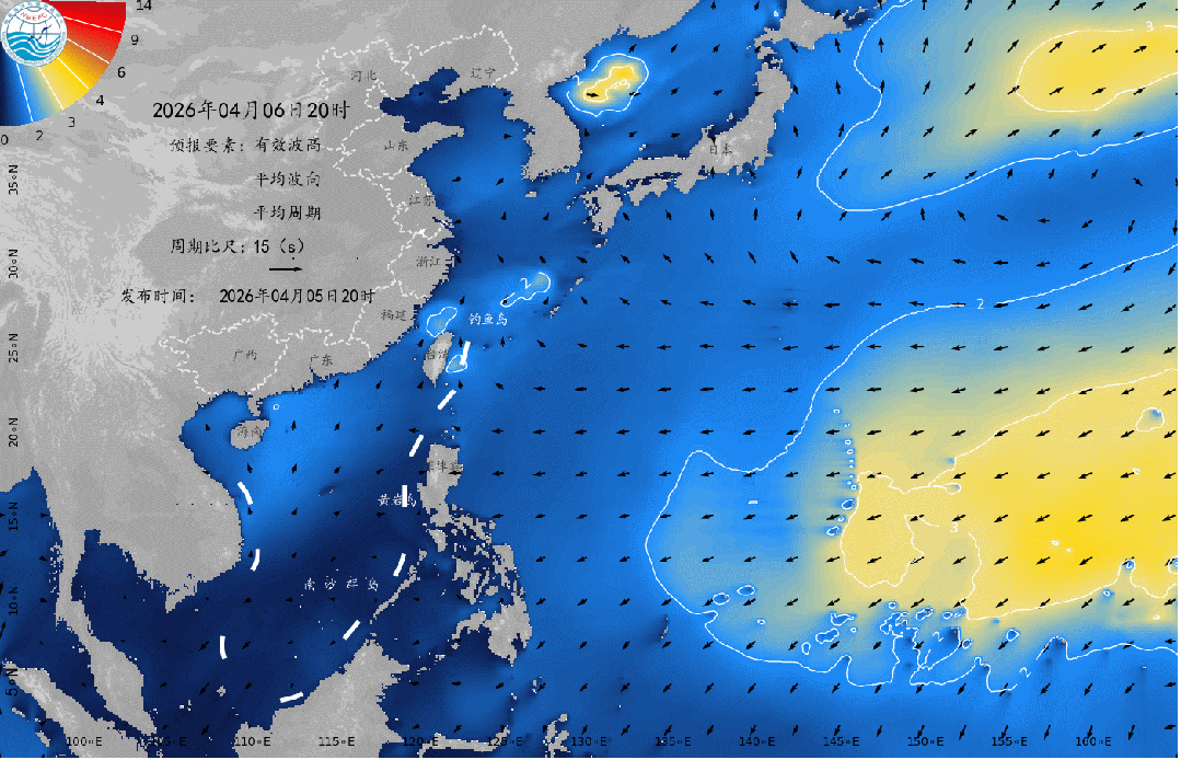 东海南部的大浪区维持,浪高1.9到2.6米;