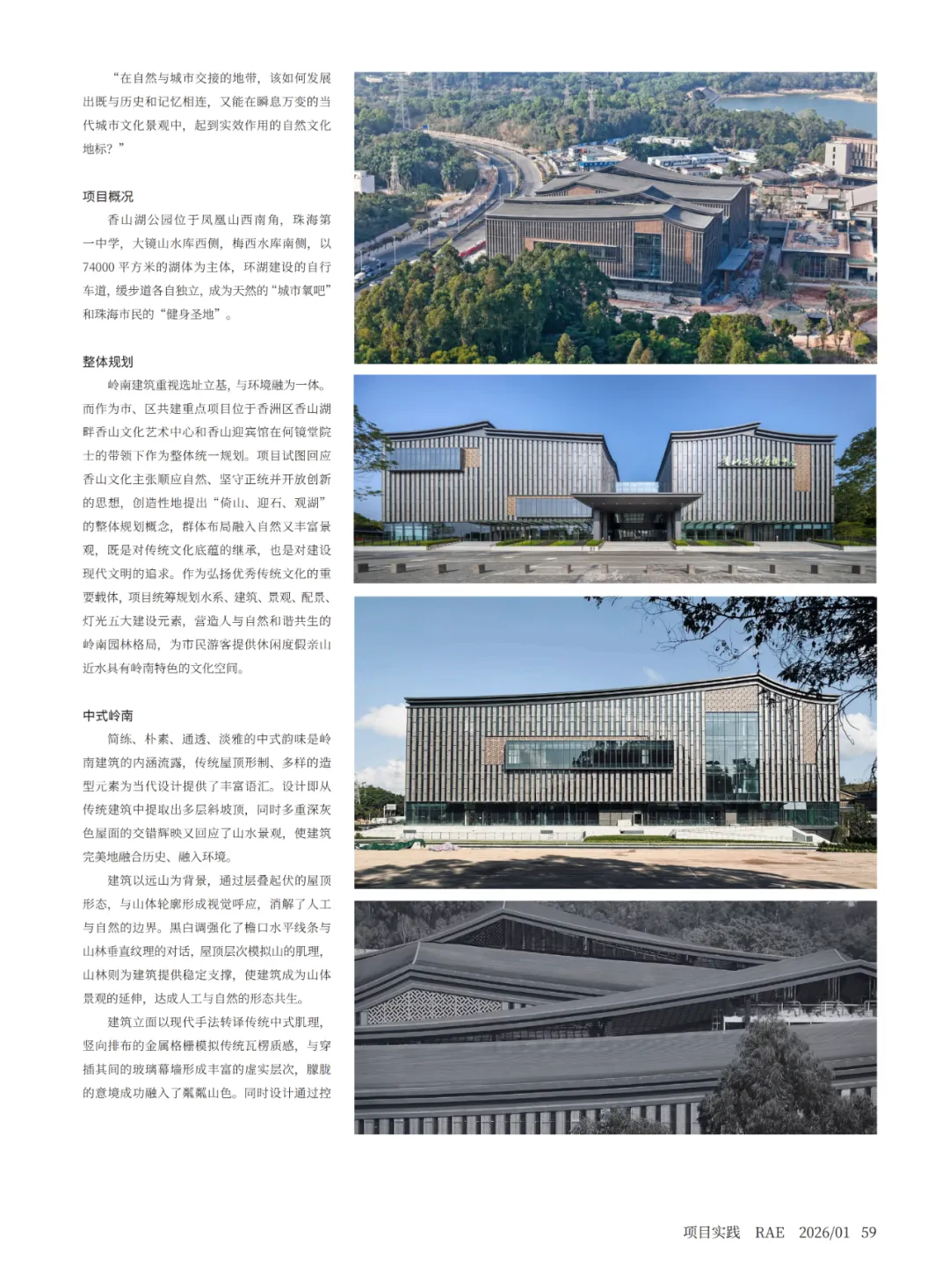 岭南建筑重视选址立基,与环境融为一体。而作为市、区共建重点项目位于香洲区香山湖畔香山文化艺术中心和香山迎宾馆在何镜堂院士的带领下作为整体统一规划。项目试图回应香山文化主张顺应自然、坚守正统并开放创新的思想,创造性地提出“倚山、迎石、观湖”的整体规划概念,群体布局融入自然又丰富景观,既是对传统文化底蕴的继承,也是对建设现代文明的追求。作为弘扬优秀传统文化的重要载体,项目统筹规划水系、建筑、景观、配景、灯光五大建设元素,营造人与自然和谐共生的岭南园林格局,为市民游客提供休闲度假亲山近水具有岭南特色的文化空间。