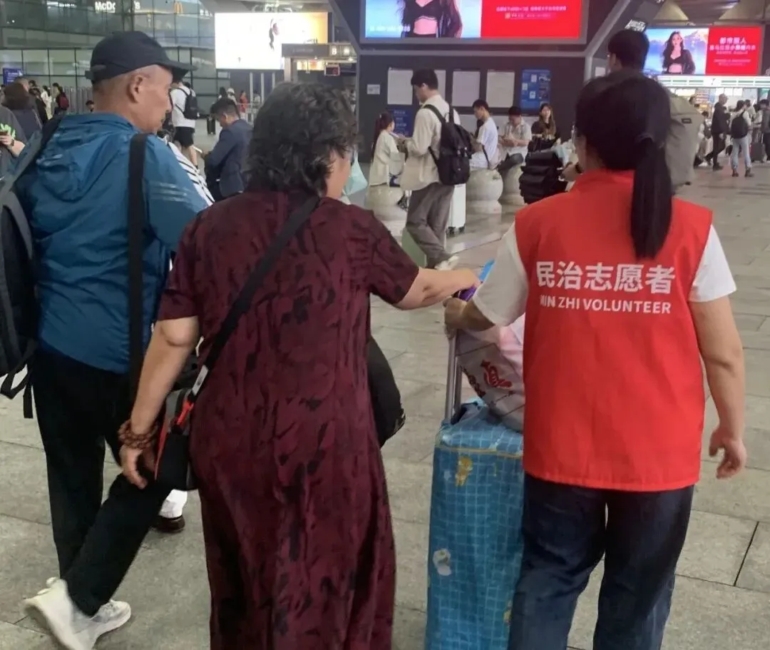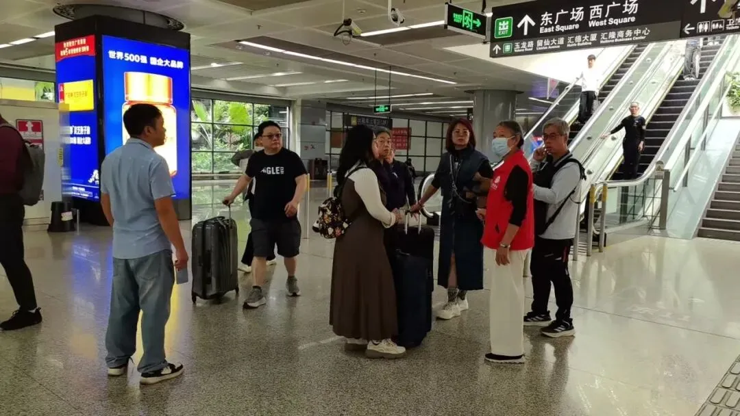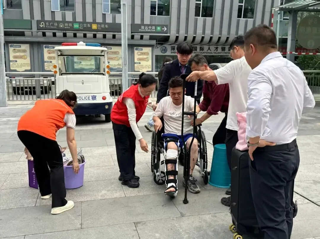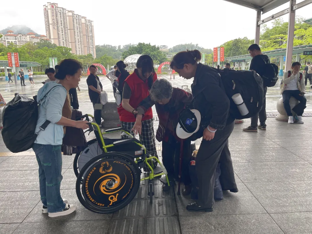 在深圳北站西广场进站口前,一位老人因身体抱恙行动困难,家属焦急地向现场志愿者求助。志愿者立即上前详细了解情况,迅速协调,为老人借来轮椅,并全程贴心护送,开辟绿色通道协助老人顺利进站。