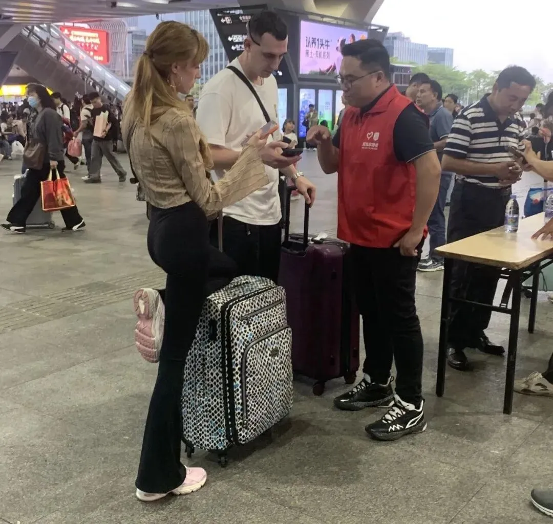 在外语志愿服务台前,三名准备从深圳北站前往香港的外国友人,因途中发现行李遗失,急忙折返车站求助。他们此前已登记失物信息,便向志愿者出示了失物招领编号。志愿者一边安抚其焦急情绪,一边通过编号查询系统,同步对接相关岗位核实查找。经过高效协调,最终成功帮外国友人找回遗失行李。