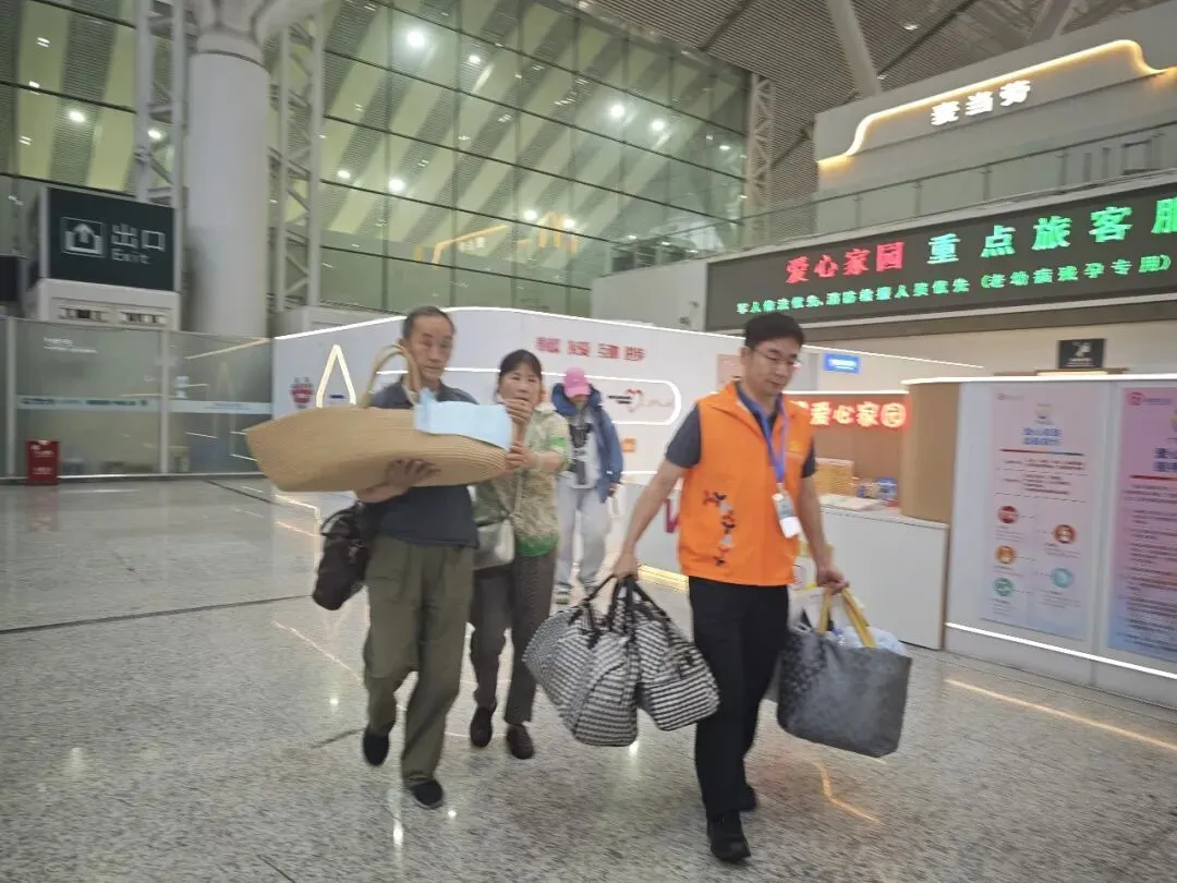 在西广场进站口外,一名右脚打着固定支架的中年男子,在两名亲友的搀扶下,艰难地一步步挪动,还随身带着不少行李。两位志愿者见状,立即上前伸出援手,一人帮助旅客整理行李、安抚情绪,一人联系高铁工作人员寻求支援,在多方接力下,将轮椅推到旅客面前,并协调出便利的通行路径。志愿者小心翼翼地搀扶受伤旅客坐下,并帮助其提起行李,一路护送其进站。