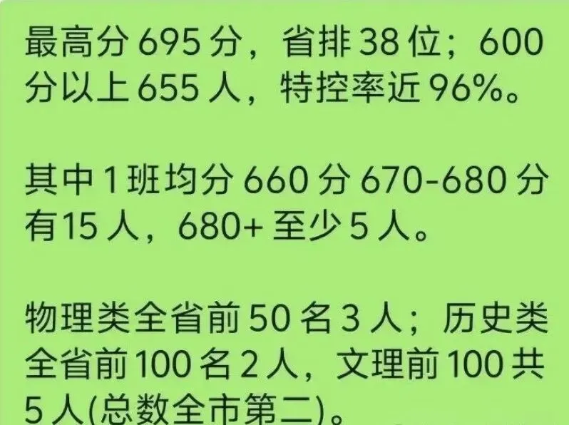 清北录取:7人(含竞赛保送、强基计划)。其中物理类最高分695分,全省排名第38位,另有2名学生也达到清北录取线。