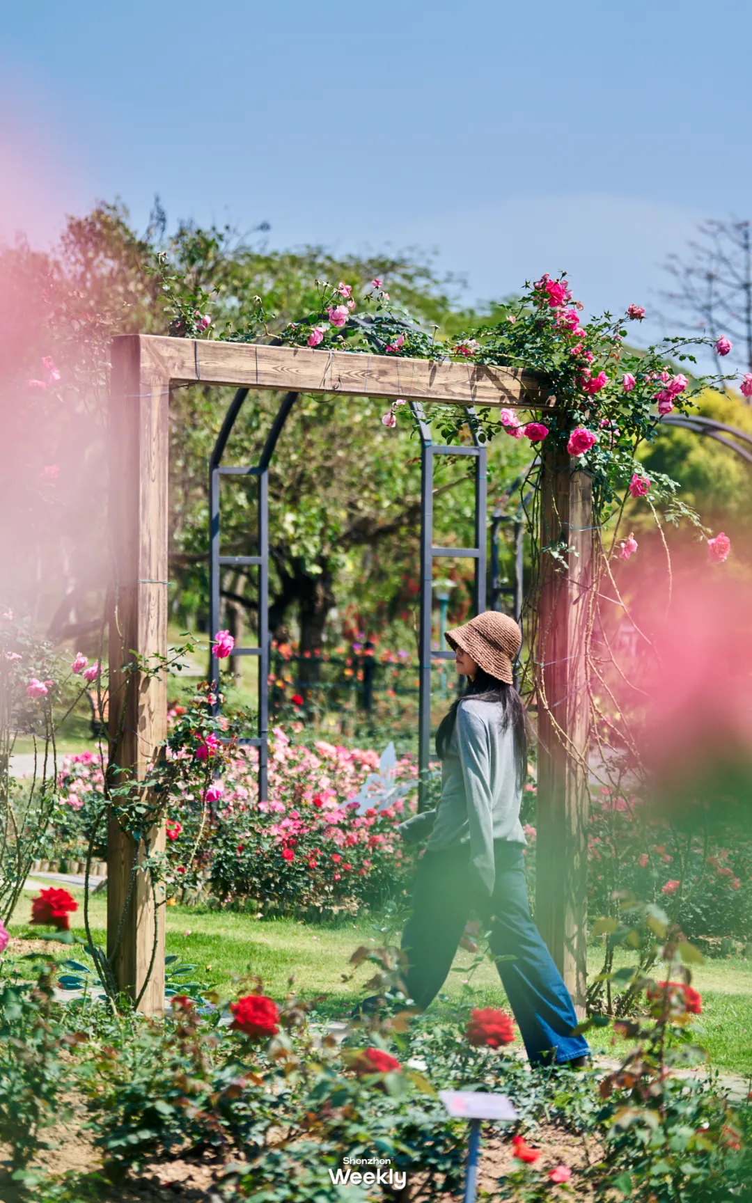 要想拍出花的美,那一定不能只拍花。花海以这座巨型鸽笼为中心,向四周延伸开来,一旁的木质拱门静静伫立在月季丛中,几株粉紫色月季花从底部缠绕而上,向阳开出了几朵最娇艳的花。