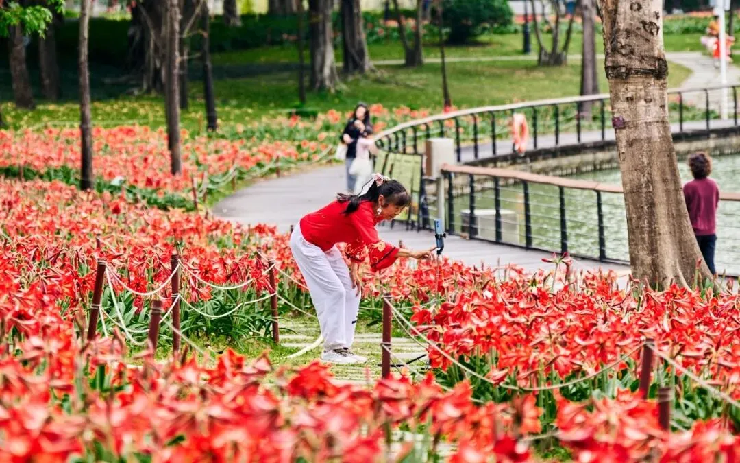 中心公园的朱顶红终于等来大面积盛放了,大片耀眼的红色铺满了湖边,似火焰般鲜活,成为了中心公园一道独特的风景线。
