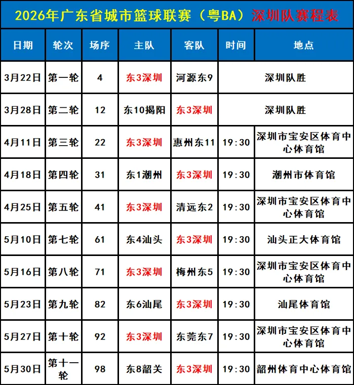 ✅深圳队比赛赛程表: