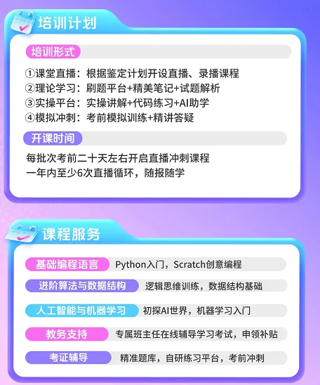 线上直播(高级)或线下面授(初中级)+录播+刷题平台+学习群+人工答疑+定期学习考试报名提醒+定期作业指导+实操模拟课(初级32学时、中级34学时、高级36学时)