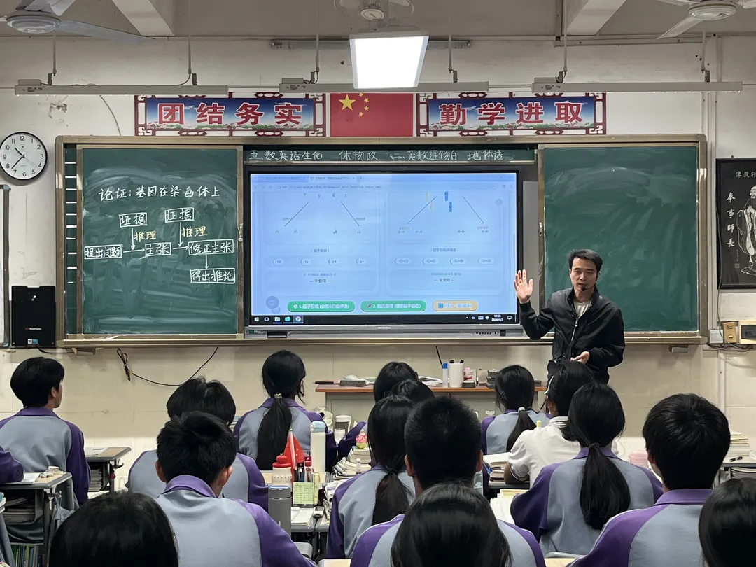 钟明声老师的《论证:基因在染色体上》,以“破案式探究”重构科学史教学。数字人摩尔根的“质疑”开场,激发学生探究欲;果蝇遗传模拟器让基因与染色体的行为对比一目了然;“摩尔根学习助手”智能体实时解答性染色体知识,助力学生排除假说、锁定结论。AI生成的仿真实验视频,让百年前的科学探索“重现”课堂。