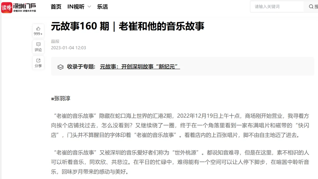 崔哥一直以来,做的都是极具深度价值的事情:他40年来收藏了许多唱片、磁带,是深圳的“声音活化石”;他为深漂、本地人提供免费的情绪出口,用音乐治愈孤独;他让陌生人因音乐结缘,形成深度情感社群,成为深圳文化的独特风景线;他为深圳本土音乐人提供展示平台,记录城市音乐文化的发展。