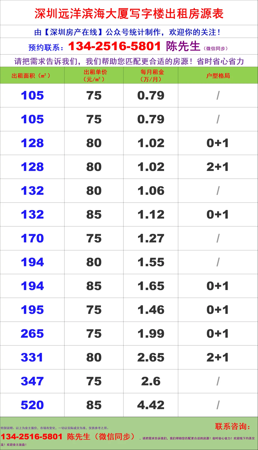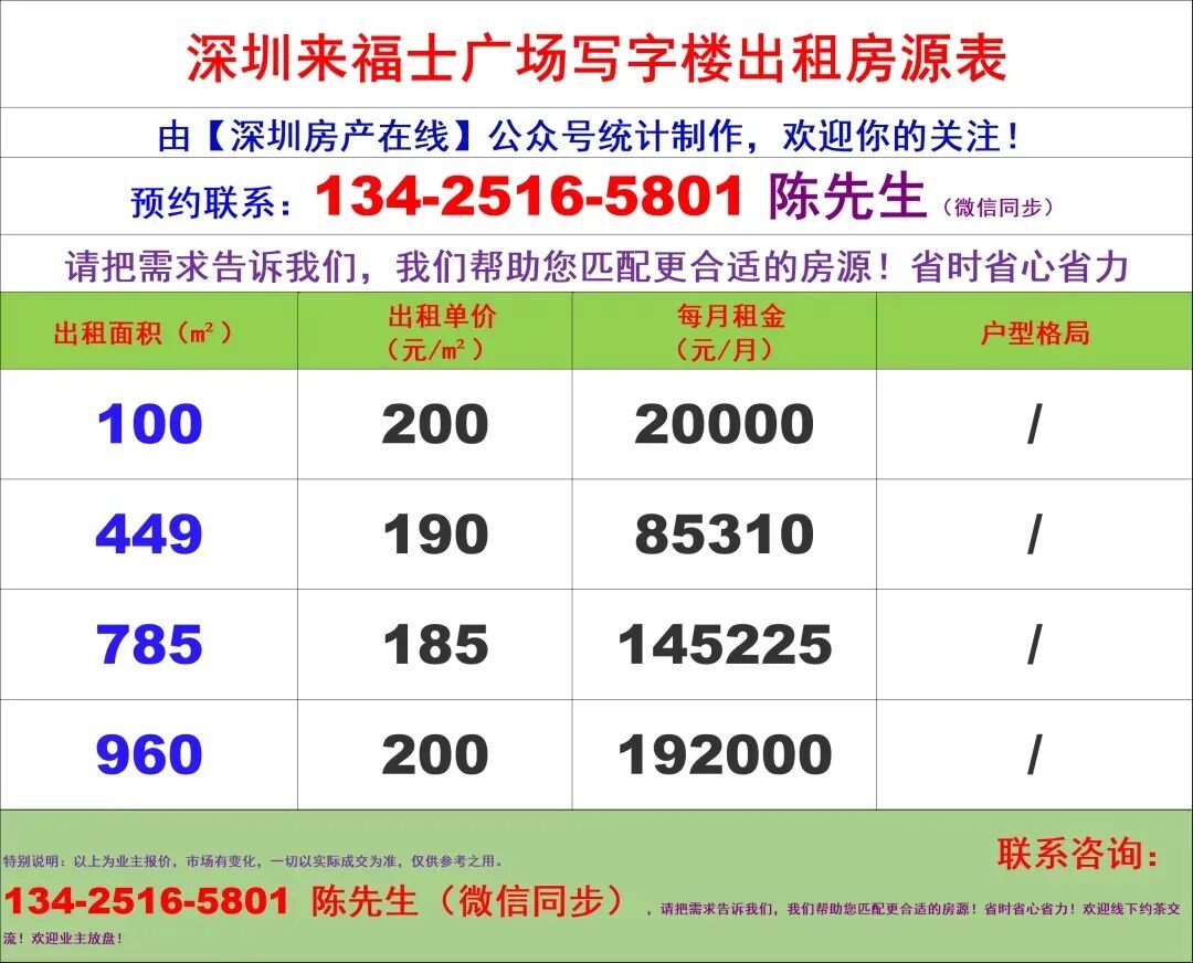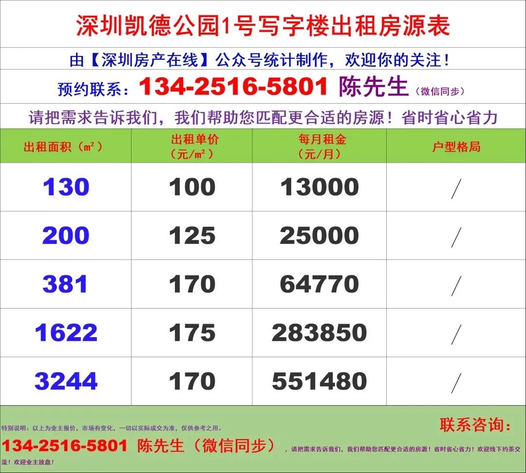 【深圳房产在线】陈经理写字楼租售团队:134-2516-5801 (微信同步)
