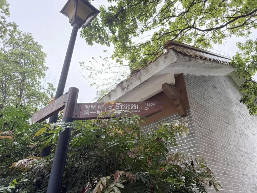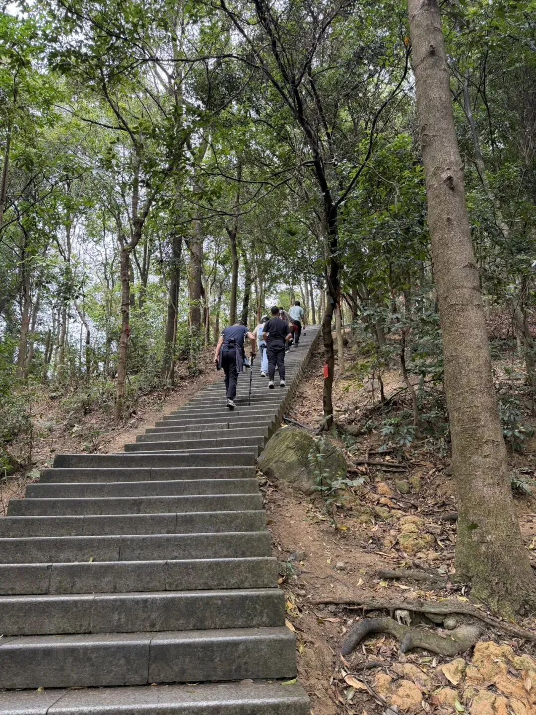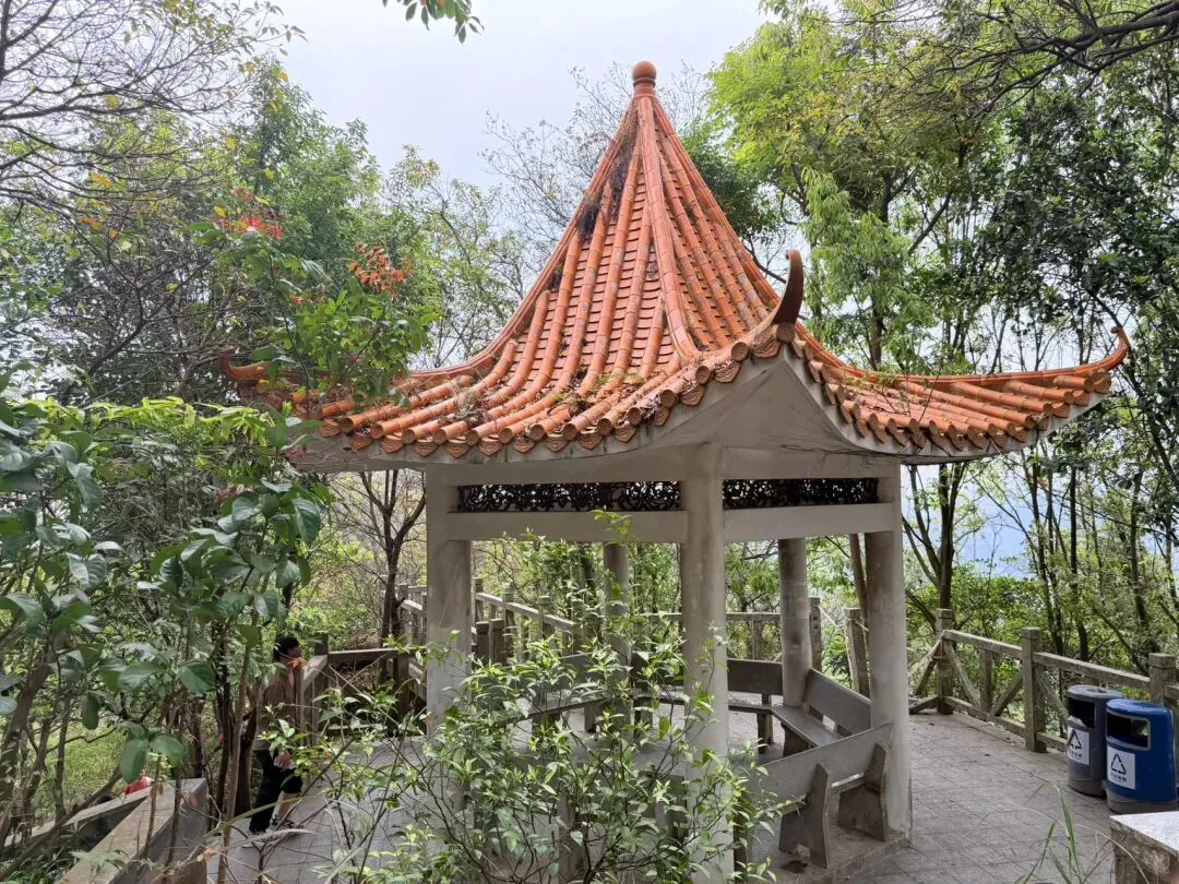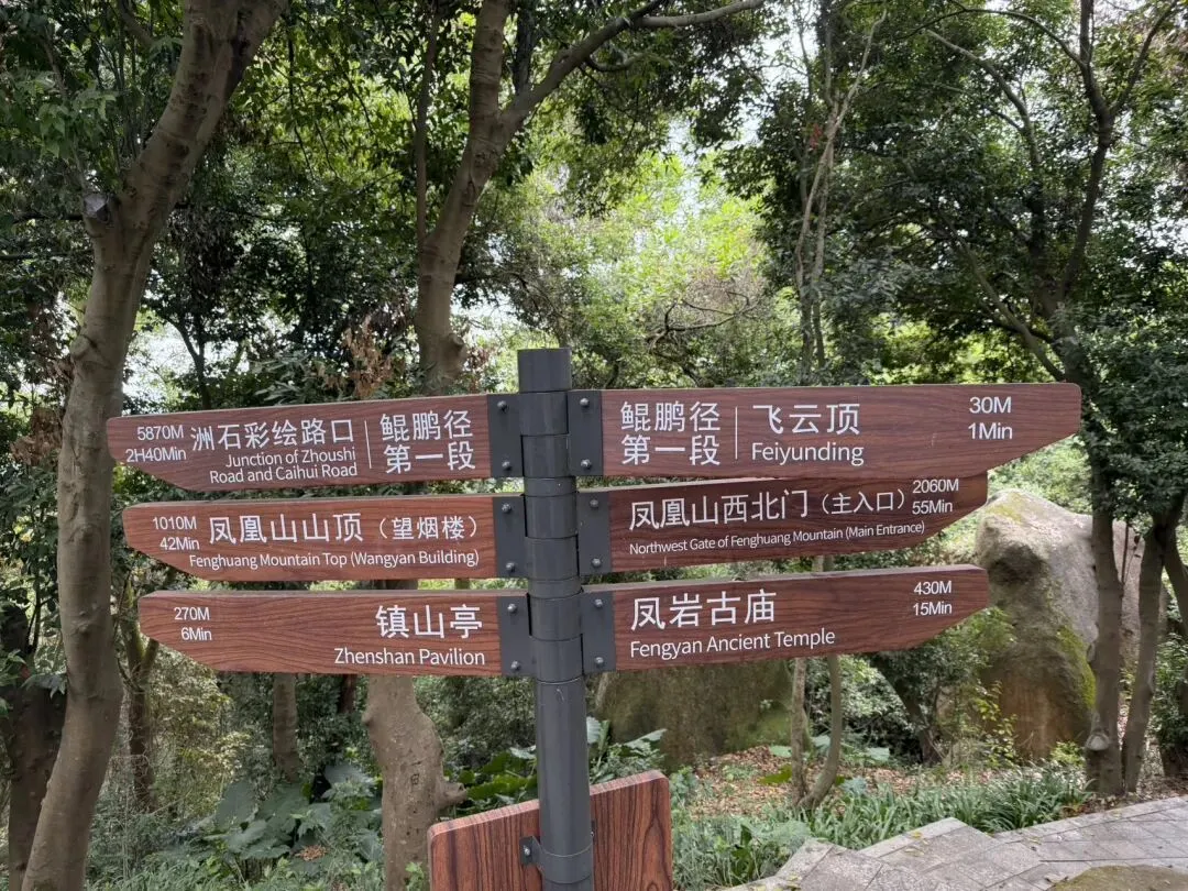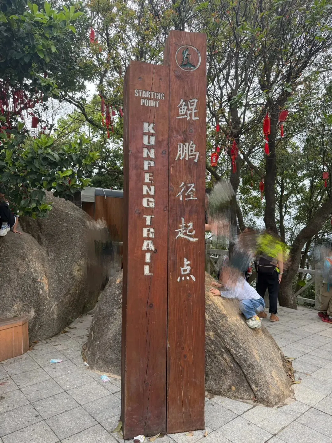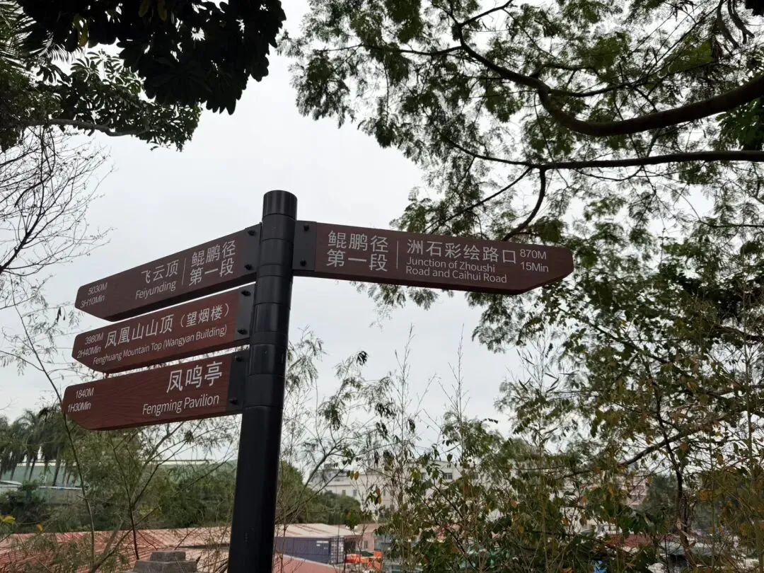 鲲鹏径第一段,从凤凰山的飞云顶经过山顶望烟楼,然后沿郊野径下山后一直走到九围湿地公园旁边的洲石彩绘路口。距离凤凰山最近的地铁站都超过两公里,所以地铁出行的话,最后一程得转公交或者打车到位于凤凰山大道的凤凰山正门。由于鲲鹏径的起点是在山上,所以,要想到起点,首先得翻一座山。我的实际耗时:11点57到13点21,共1小时24分钟“凤凰山”大石头右侧,就是登山道,再往右,还有一条,也是通往飞云顶的。离石头近的这条,指示牌上给的参考时间是五十分钟;更右边的那条,耗时五十五分钟。由于两条都途径凤凰书院和凤岩古庙,如果驻足逗留,上个卫生间什么的,全程就不止五十或者五十五分钟了。去的那天下了场蒙蒙小雨,但是依然挡不住登山的热情。我选的是更右侧55分钟的那条沿溪路,因为一开始看起来更平缓一些。预备段我没有拍出来的是,沿途有卖香火的,有看命算卦的,还有卖玩具的。这应该是凤凰山独有的特色吧。途中还在一个凉亭处歇了一会喝水,到达凤凰书院时,刚好用时四十分钟。流连片刻,拍下了被春天的新绿笼罩着的凤凰书院,和它对面下坡处的有素菜馆的游客服务区。从书院路口右转上去,就是凤岩古庙。古庙香火甚是旺盛,善男信女们俯身便拜。而我,纯粹是路过看风景。