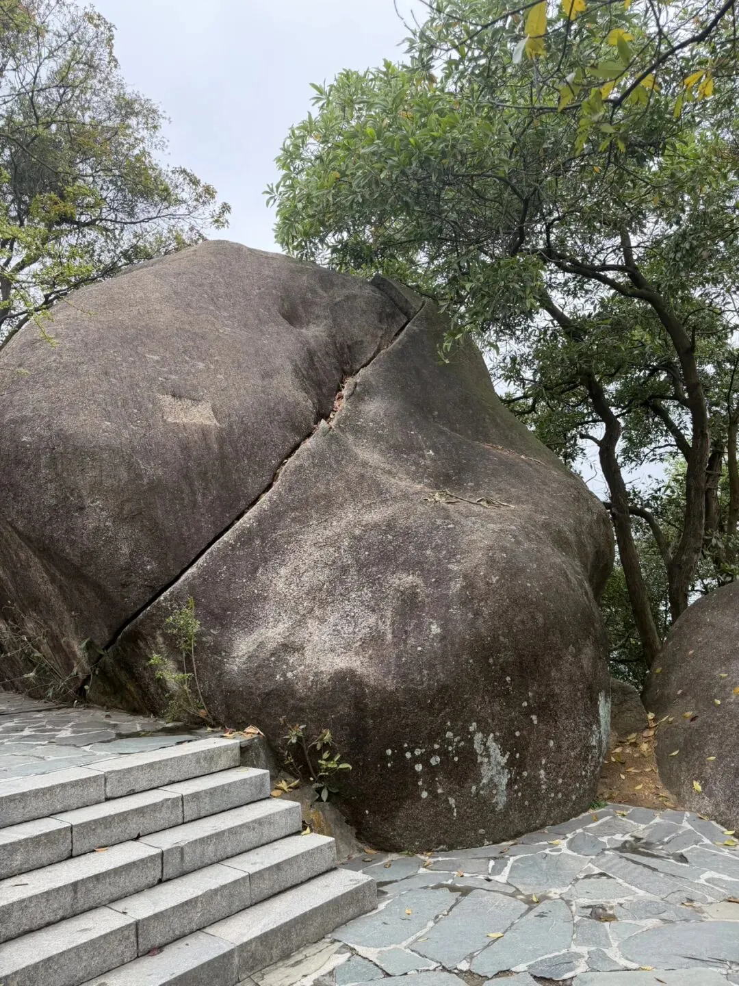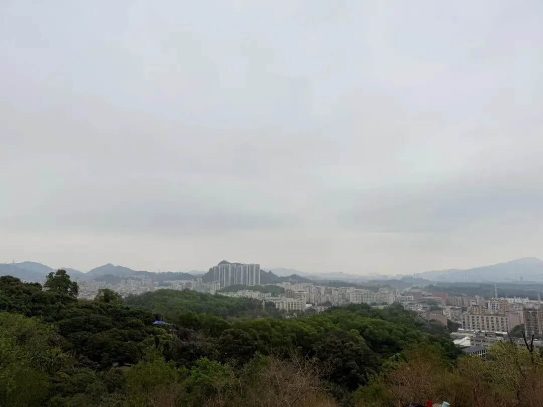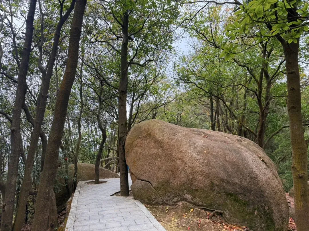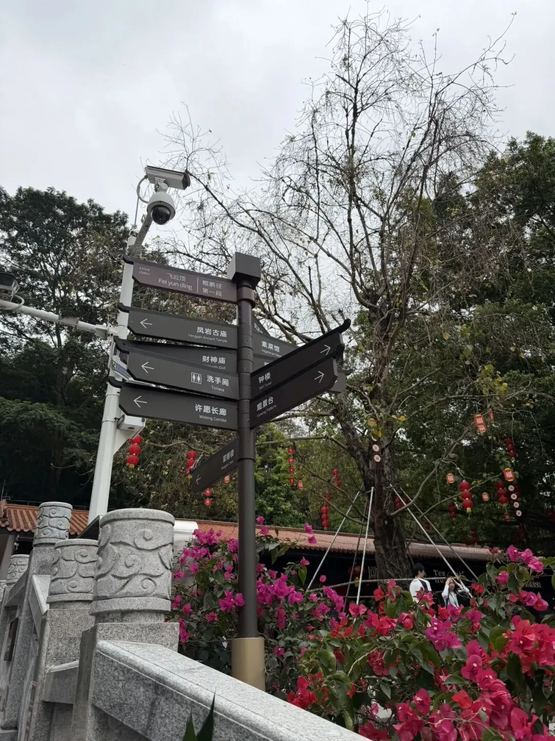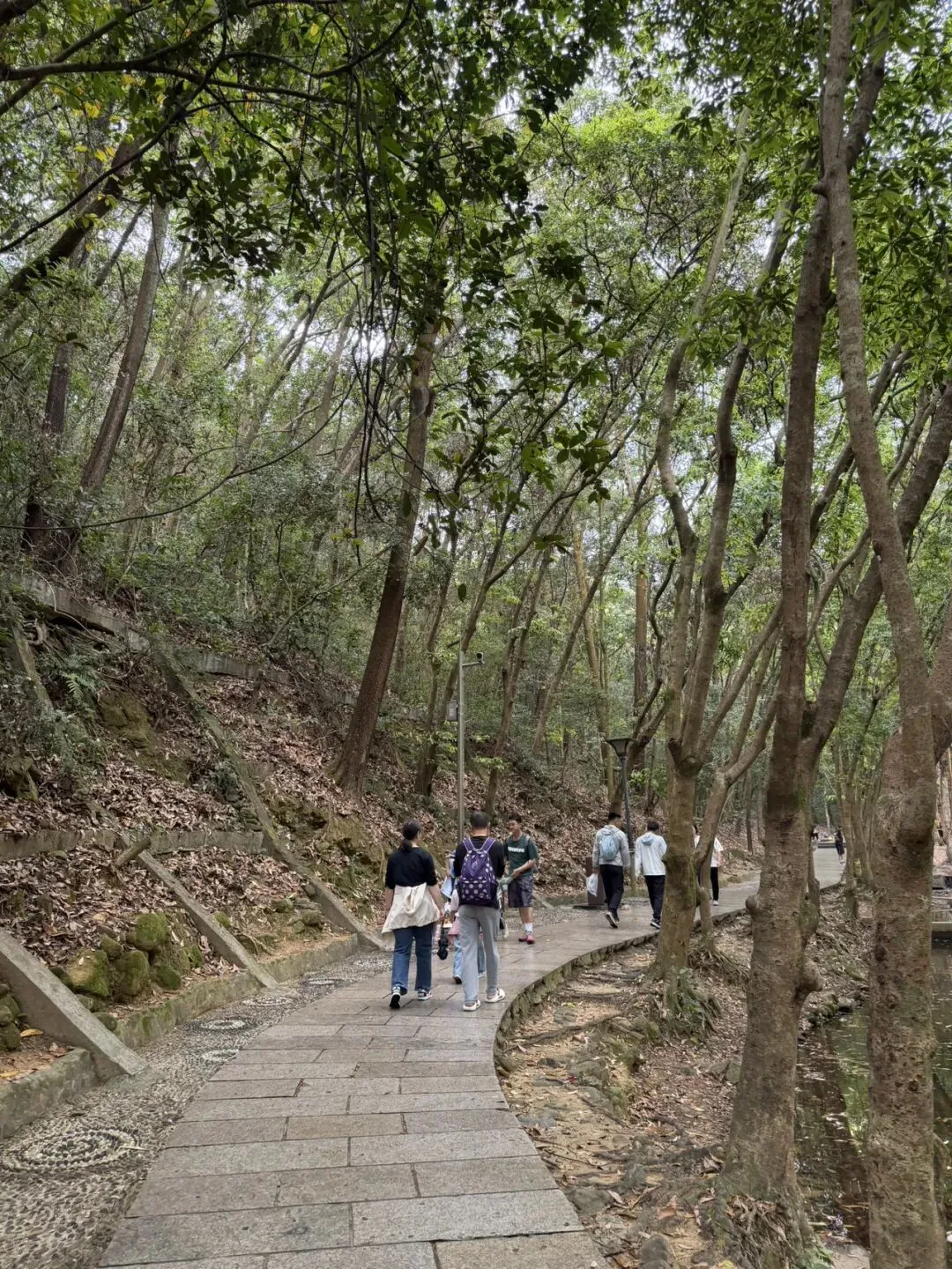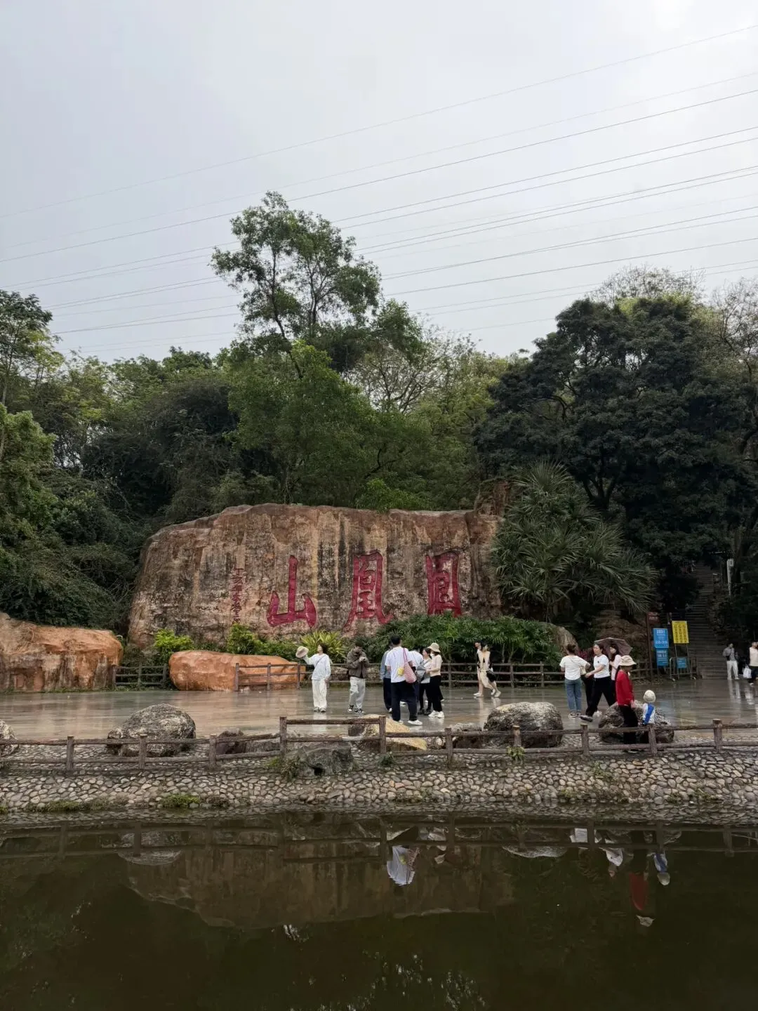 鲲鹏径第一段,从凤凰山的飞云顶经过山顶望烟楼,然后沿郊野径下山后一直走到九围湿地公园旁边的洲石彩绘路口。距离凤凰山最近的地铁站都超过两公里,所以地铁出行的话,最后一程得转公交或者打车到位于凤凰山大道的凤凰山正门。由于鲲鹏径的起点是在山上,所以,要想到起点,首先得翻一座山。我的实际耗时:11点57到13点21,共1小时24分钟“凤凰山”大石头右侧,就是登山道,再往右,还有一条,也是通往飞云顶的。离石头近的这条,指示牌上给的参考时间是五十分钟;更右边的那条,耗时五十五分钟。由于两条都途径凤凰书院和凤岩古庙,如果驻足逗留,上个卫生间什么的,全程就不止五十或者五十五分钟了。去的那天下了场蒙蒙小雨,但是依然挡不住登山的热情。我选的是更右侧55分钟的那条沿溪路,因为一开始看起来更平缓一些。预备段我没有拍出来的是,沿途有卖香火的,有看命算卦的,还有卖玩具的。这应该是凤凰山独有的特色吧。途中还在一个凉亭处歇了一会喝水,到达凤凰书院时,刚好用时四十分钟。流连片刻,拍下了被春天的新绿笼罩着的凤凰书院,和它对面下坡处的有素菜馆的游客服务区。从书院路口右转上去,就是凤岩古庙。古庙香火甚是旺盛,善男信女们俯身便拜。而我,纯粹是路过看风景。