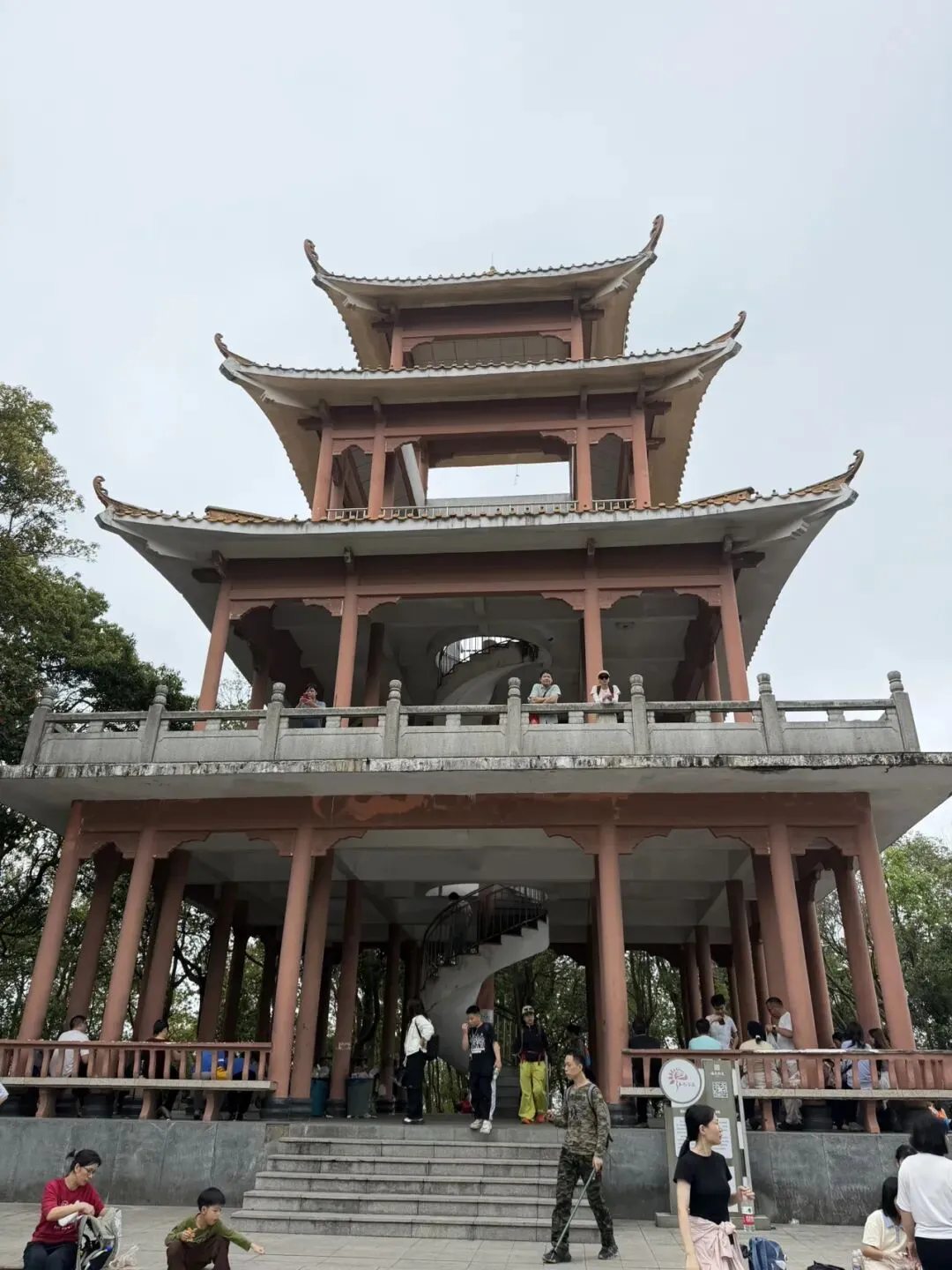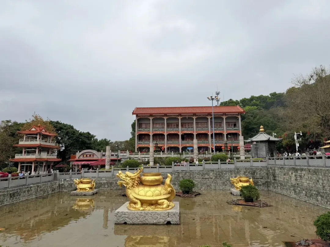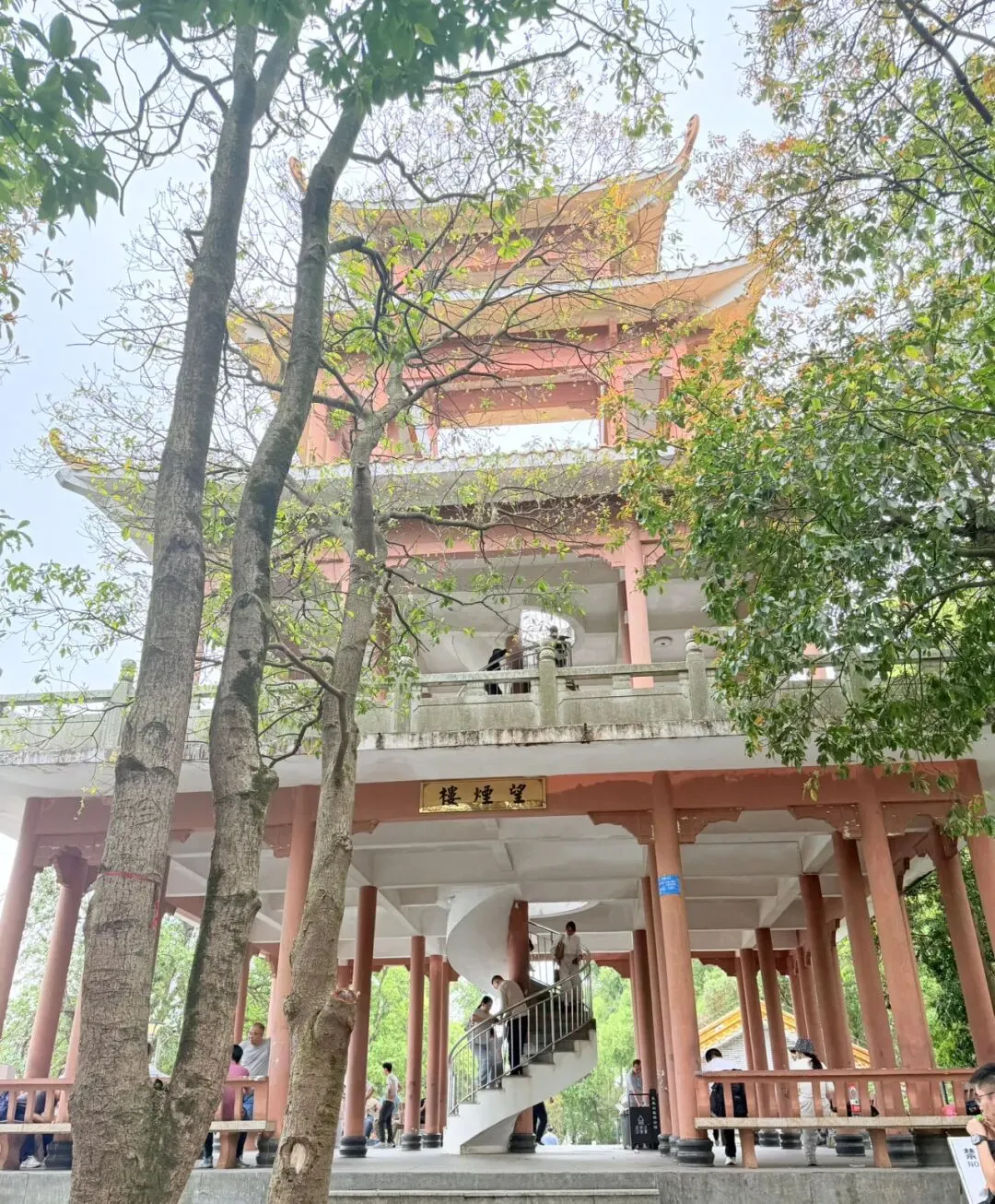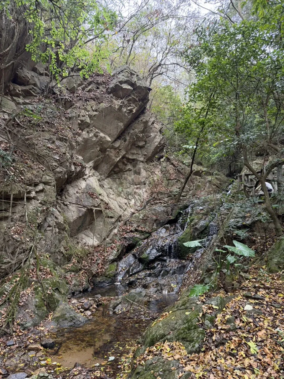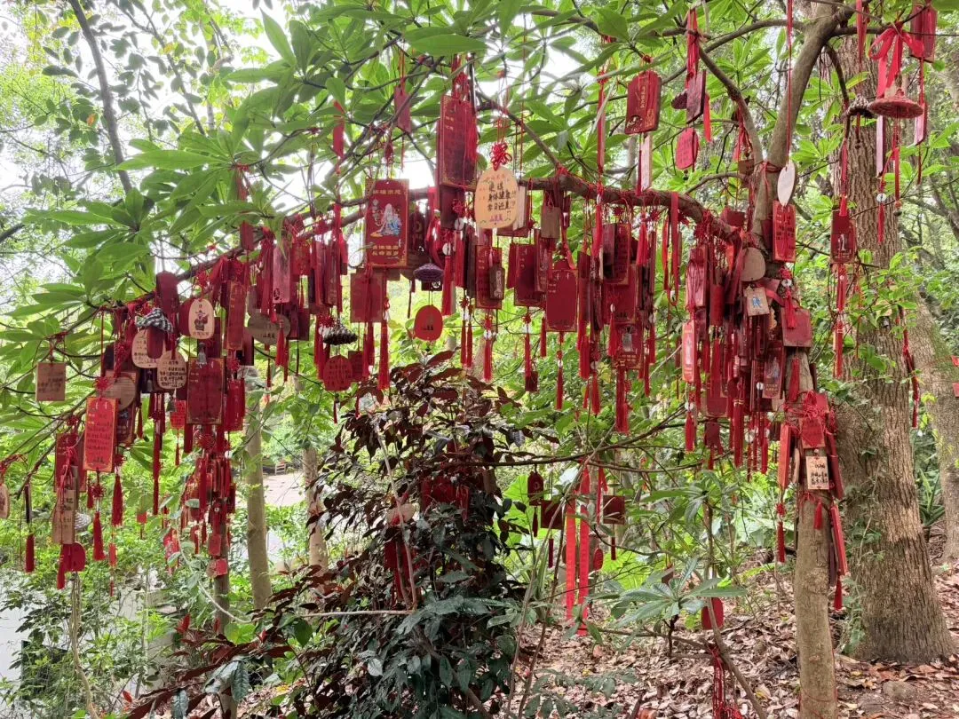 鲲鹏径第一段,从凤凰山的飞云顶经过山顶望烟楼,然后沿郊野径下山后一直走到九围湿地公园旁边的洲石彩绘路口。距离凤凰山最近的地铁站都超过两公里,所以地铁出行的话,最后一程得转公交或者打车到位于凤凰山大道的凤凰山正门。由于鲲鹏径的起点是在山上,所以,要想到起点,首先得翻一座山。我的实际耗时:11点57到13点21,共1小时24分钟“凤凰山”大石头右侧,就是登山道,再往右,还有一条,也是通往飞云顶的。离石头近的这条,指示牌上给的参考时间是五十分钟;更右边的那条,耗时五十五分钟。由于两条都途径凤凰书院和凤岩古庙,如果驻足逗留,上个卫生间什么的,全程就不止五十或者五十五分钟了。去的那天下了场蒙蒙小雨,但是依然挡不住登山的热情。我选的是更右侧55分钟的那条沿溪路,因为一开始看起来更平缓一些。预备段我没有拍出来的是,沿途有卖香火的,有看命算卦的,还有卖玩具的。这应该是凤凰山独有的特色吧。途中还在一个凉亭处歇了一会喝水,到达凤凰书院时,刚好用时四十分钟。流连片刻,拍下了被春天的新绿笼罩着的凤凰书院,和它对面下坡处的有素菜馆的游客服务区。从书院路口右转上去,就是凤岩古庙。古庙香火甚是旺盛,善男信女们俯身便拜。而我,纯粹是路过看风景。