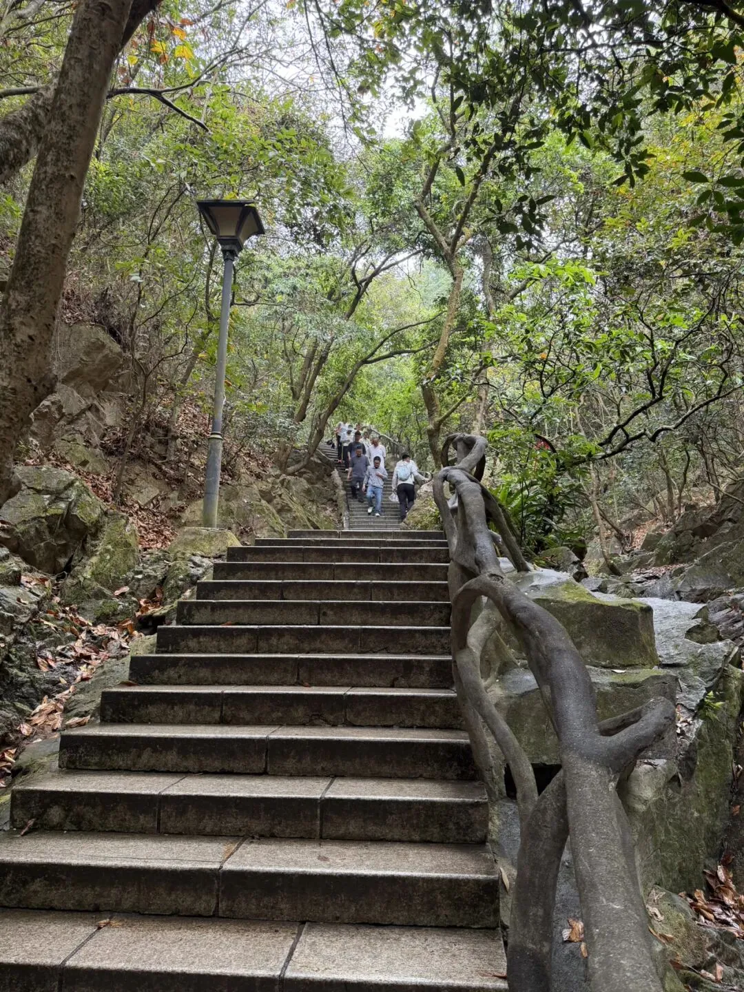 经过财神庙就来到了登山口,登山口附近是财源滚滚的装饰。从凤岩古庙往飞云顶的这一段,路边显示是2号登山道,指示牌显示需要15分钟。这段全程是台阶,传说中“徒步佬最讨厌的路”。中途气喘乏力时坐下来歇了一会儿,最后耗时16分钟到达。这段台阶有500阶左右,每隔50阶,有数字显示。本次徒步之后的感觉是,这16分钟,在完成整个鲲鹏径一段的旅程中最累的。而最累的这段,只是为了到达起点。