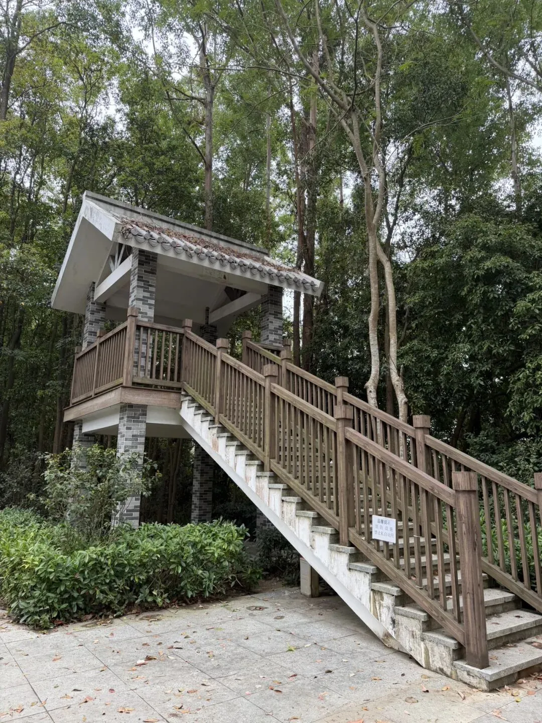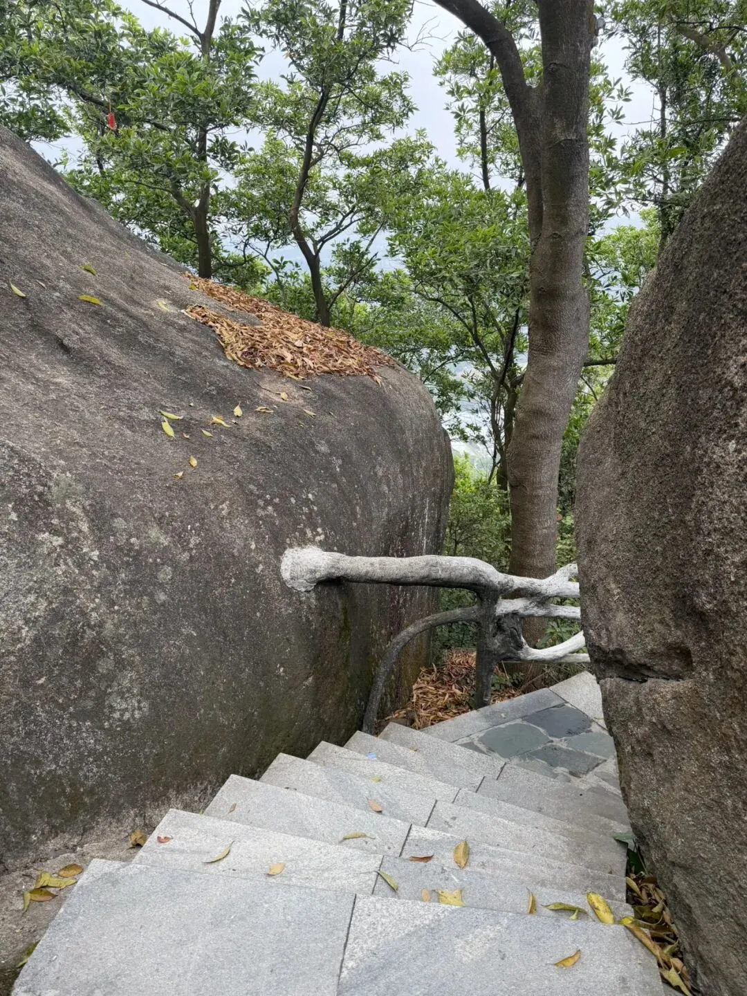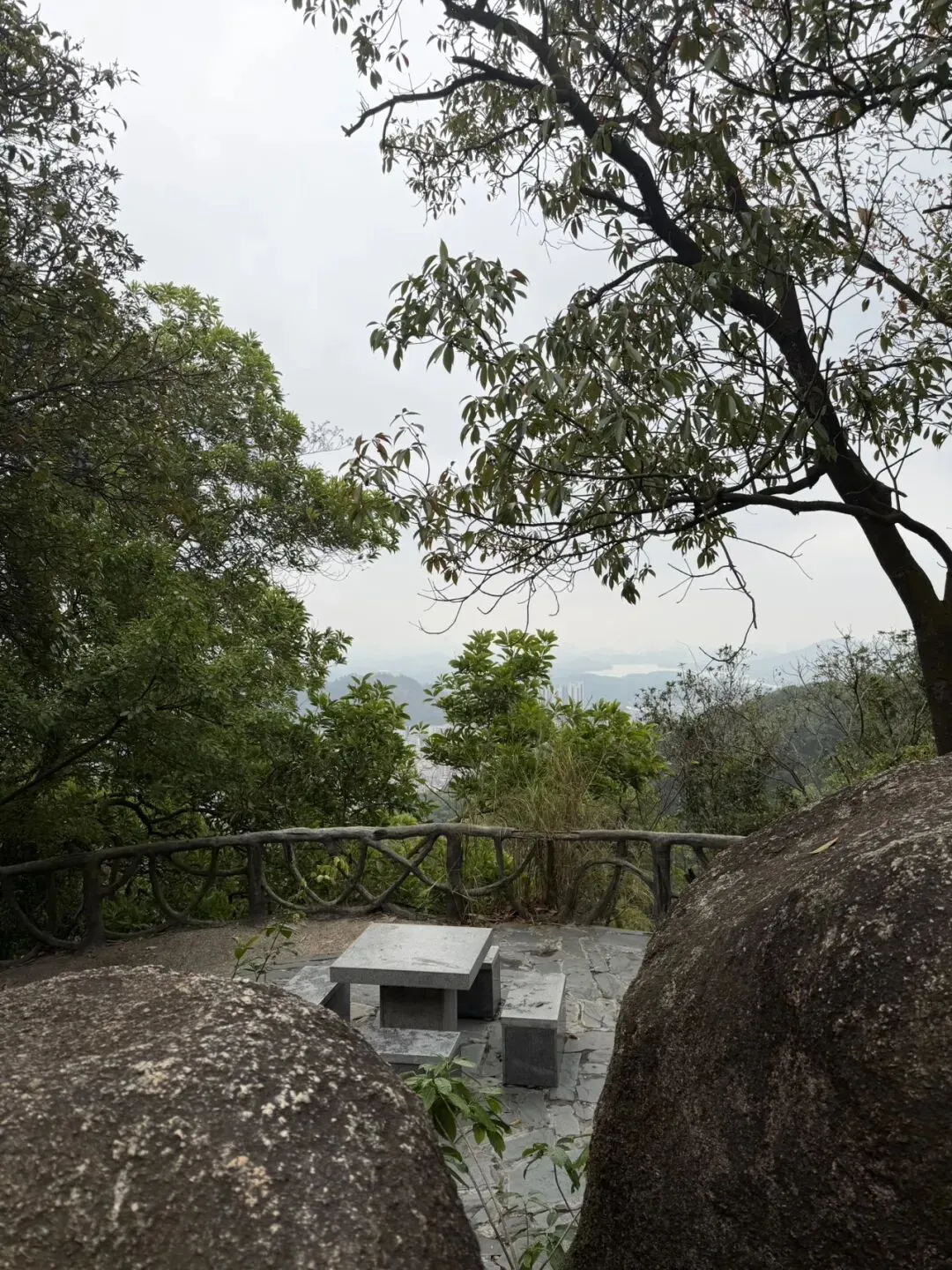 飞云顶面积不大,有游客服务中心,也有休息处,当然最知名的打卡点就是“鲲鹏径起点”的立柱牌。指示牌显示,到望烟楼需要42分钟。我实际用时40分钟。这一段也是全部台阶。这段最大的特色是,大部分时候要在大石头丛中穿行。穿越完大石头,在到达望烟楼之前,也得继续爬一段楼梯。但是经过了预备段的爬楼梯磨炼,这一段的就不觉得有多难了。到达望烟楼。旁边有个扫码打卡点,显示凤凰山海拔376米,是宝安区最高峰。可惜,由于手机网络不行,扫码失败。鲲鹏径一段之Part 2:山林郊野径