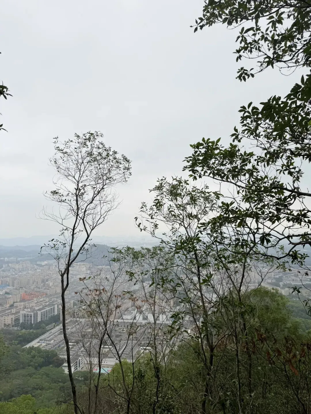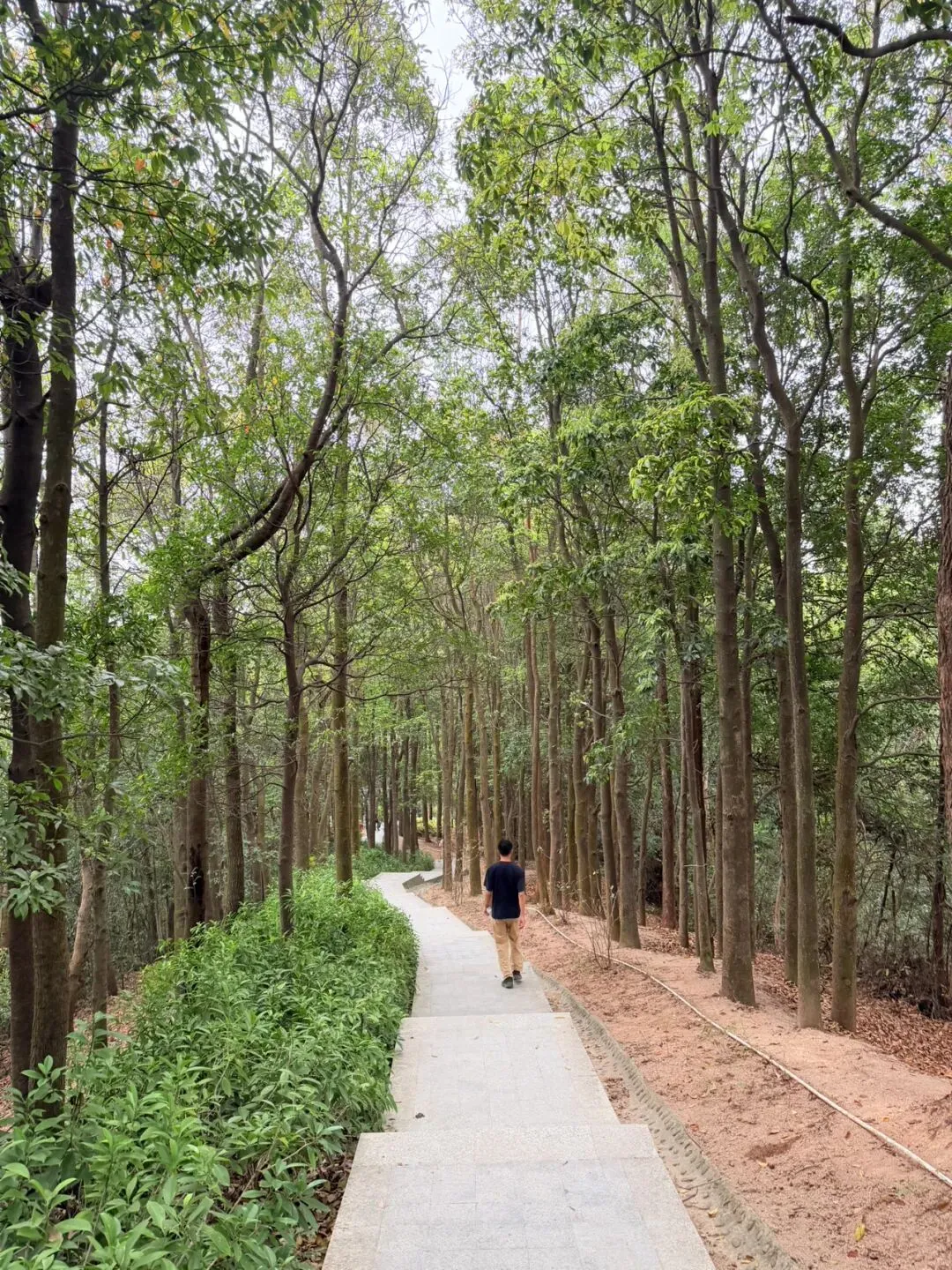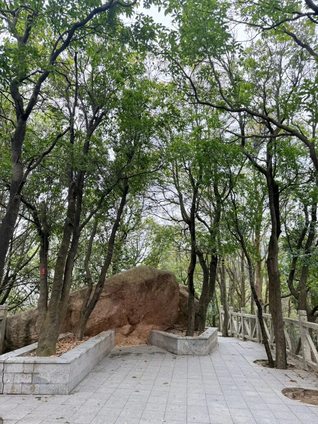飞云顶面积不大,有游客服务中心,也有休息处,当然最知名的打卡点就是“鲲鹏径起点”的立柱牌。指示牌显示,到望烟楼需要42分钟。我实际用时40分钟。这一段也是全部台阶。这段最大的特色是,大部分时候要在大石头丛中穿行。穿越完大石头,在到达望烟楼之前,也得继续爬一段楼梯。但是经过了预备段的爬楼梯磨炼,这一段的就不觉得有多难了。到达望烟楼。旁边有个扫码打卡点,显示凤凰山海拔376米,是宝安区最高峰。可惜,由于手机网络不行,扫码失败。鲲鹏径一段之Part 2:山林郊野径