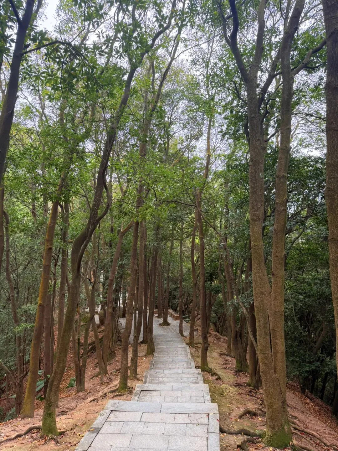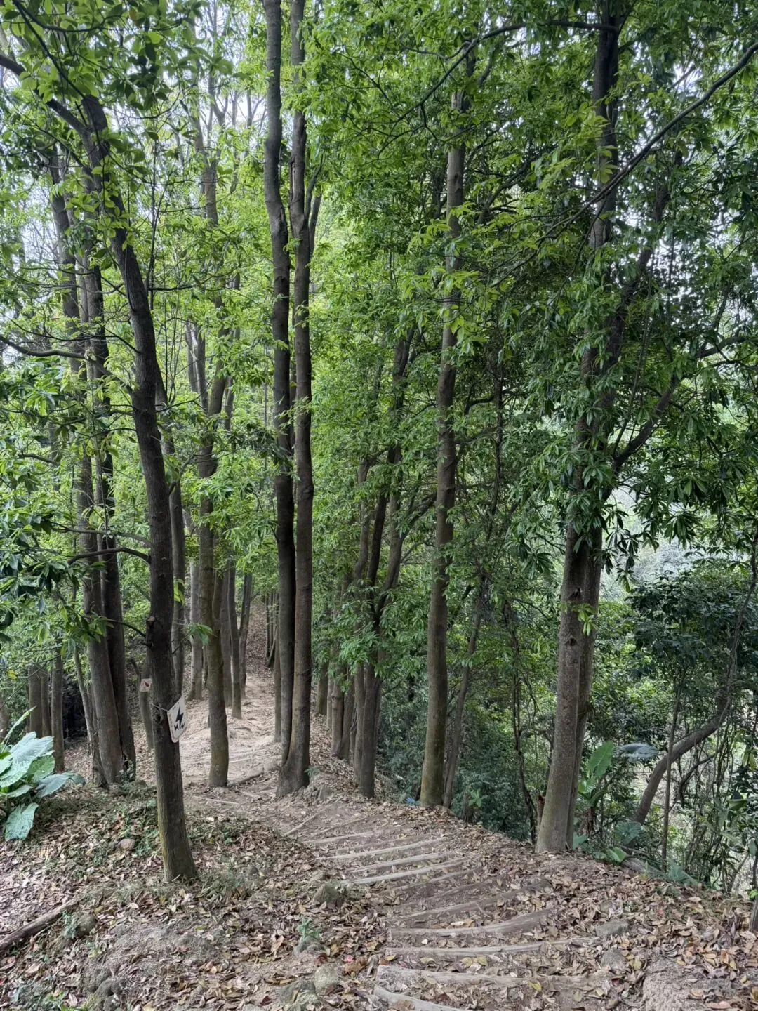 望烟楼后方广场,左侧有指示牌,两小时可到终点。指示牌右边,就是继续前行的路,这一段,全程在遮天蔽日的山林间,而且基本都是下坡,走起来毫无压力。
