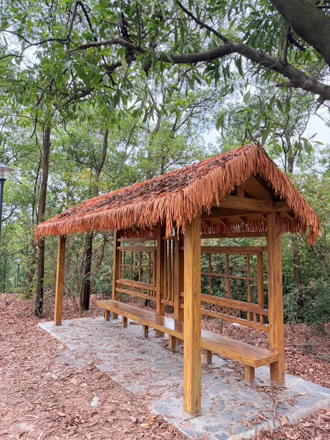 在山林中一边前行一边看着春天养眼的绿色,太舒服惬意了。遇到岔路口,不用担心,按照指示牌走就行了。这一段的指示牌,还是相当清晰的,密度也足够。下图亭子对面就有个指示牌。这个别致的小亭子,不是观景台,是消防设施。第一段之Part 3:下山楼梯和环山栈道