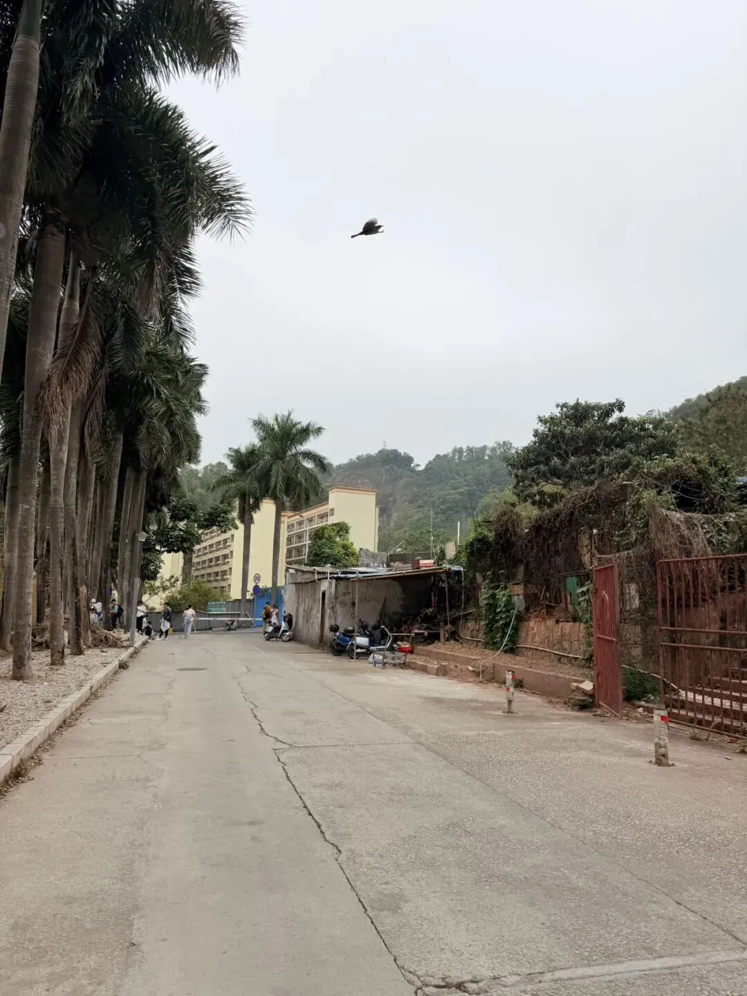 十分钟左右,来到一个养鸡场旁边。养鸡场路边,可以回望已经走过的山坡和山下的城市。继续沿着土路跟着指示牌前行。路边的茅檐休憩亭甚是可爱。下山了,走到平路上。当时随手拍的一张图,回来发现,上方居然有一只翱翔的,我叫不出来名字的鸟,看起来身形不小。平路尽头,跟着指示牌,穿过富源教育城旁边的路,走到尽头,就是洲石路。右转,沿着洲石路走到“金桂园”大门口,过到路对面,胜利到达终点:洲石彩绘路口。下山后的这段路,共用时15分钟。按照指示牌上的参考用时,从飞云顶到洲石彩绘路口需要2小时40分钟。从13点38分开始,到16点07分到达目的地,我的实际用时是2小时30分钟。