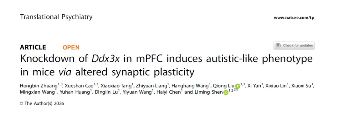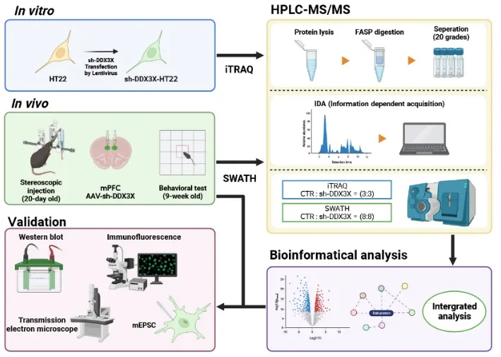 近日,深圳大学生命与海洋科学学院沈立明教授团队在国际期刊Translational Psychiatry在线发表题为“Knockdown of Ddx3x in mPFC induces autistic-like phenotype in mice via altered synaptic plasticity”的研究论文。该研究通过构建HT22细胞Ddx3x敲低模型和小鼠内侧前额叶皮层(medial prefrontal cortex, mPFC)神经元特异性Ddx3x敲低模型,结合行为学、蛋白质组学、形态学和电生理学多维度分析(图1),系统揭示了DDX3X缺陷导致ASD样行为的潜在分子机制,提示突触可塑性异常和突触蛋白稳态失衡可能是其中的重要病理基础。(拓展阅读:沈立明课题组相关研究进展,详见“逻辑神经科学”报道(点击阅读):Mol Neurobiol︱深圳大学沈立明团队揭示接触蛋白4基因缺失小鼠出现孤独症样行为并伴肠脑轴代谢异常)
