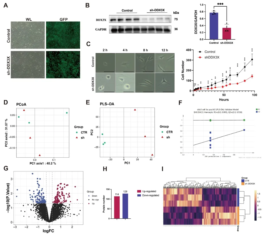图2. HT22 细胞Ddx3x敲低验证及 iTRAQ 蛋白质组学分析结果