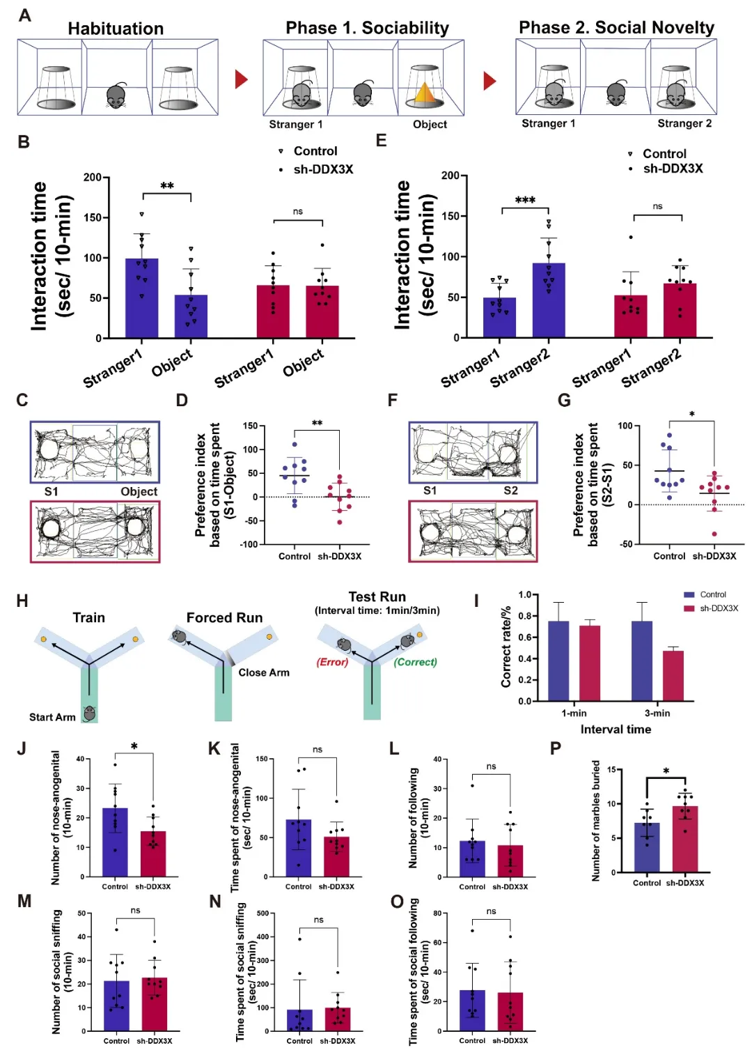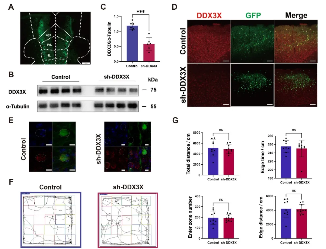 随后,研究团队对模型小鼠开展系统的行为学检测。旷场实验结果显示,Ddx3x敲低未显著影响小鼠总移动距离、区域进入次数及边缘停留时间,说明模型小鼠的基础运动能力和焦虑样行为无明显异常,排除了非特异性因素的干扰(图3F, G)。