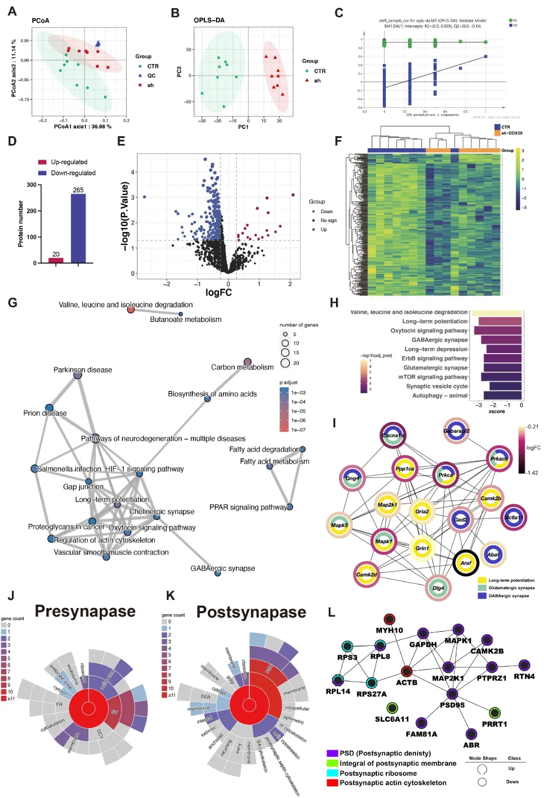 通路富集分析发现,这些差异蛋白主要富集于长时程增强(long-term potentiation, LTP)、谷氨酸能突触、GABA能突触、突触后致密区(postsynaptic density, PSD)、支链氨基酸降解及催产素信号通路等与突触功能密切相关的通路;进一步的SynGO突触特异性注释分析表明,差异蛋白显著富集于突触前、突触后及PSD相关结构,提示DDX3X缺陷对突触信号传递和突触结构维持产生了广泛且直接的影响(图5)。