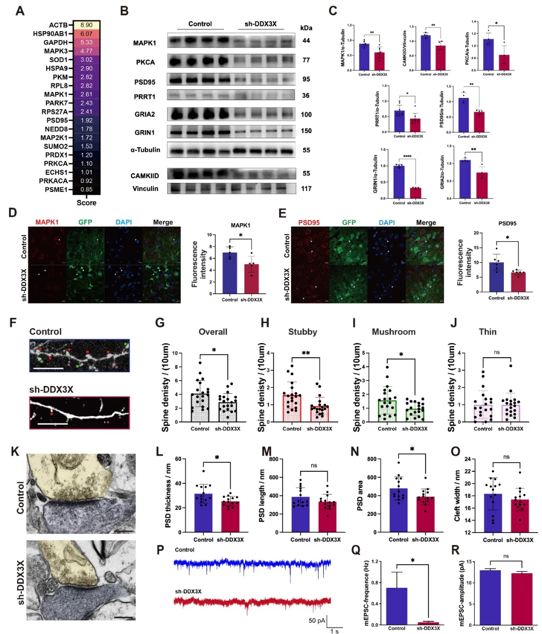 为验证蛋白质组学结果,研究团队检测了多个与突触可塑性密切相关的关键蛋白,包括MAPK1、PKCA、PSD95、PRRT1、GRIA2、GRIN1和CAMKIID,结果发现这些蛋白在Ddx3x敲低组中均显著下调。其中,MAPK1、PKCA、CAMKIID 参与LTP相关信号转导,PSD95、PRRT1调控突触后支架结构与受体定位,GRIA2、GRIN1则为AMPA、NMDA谷氨酸受体核心成分,提示DDX3X缺陷通过影响突触后信号整合和支架稳定性,直接削弱突触可塑性。