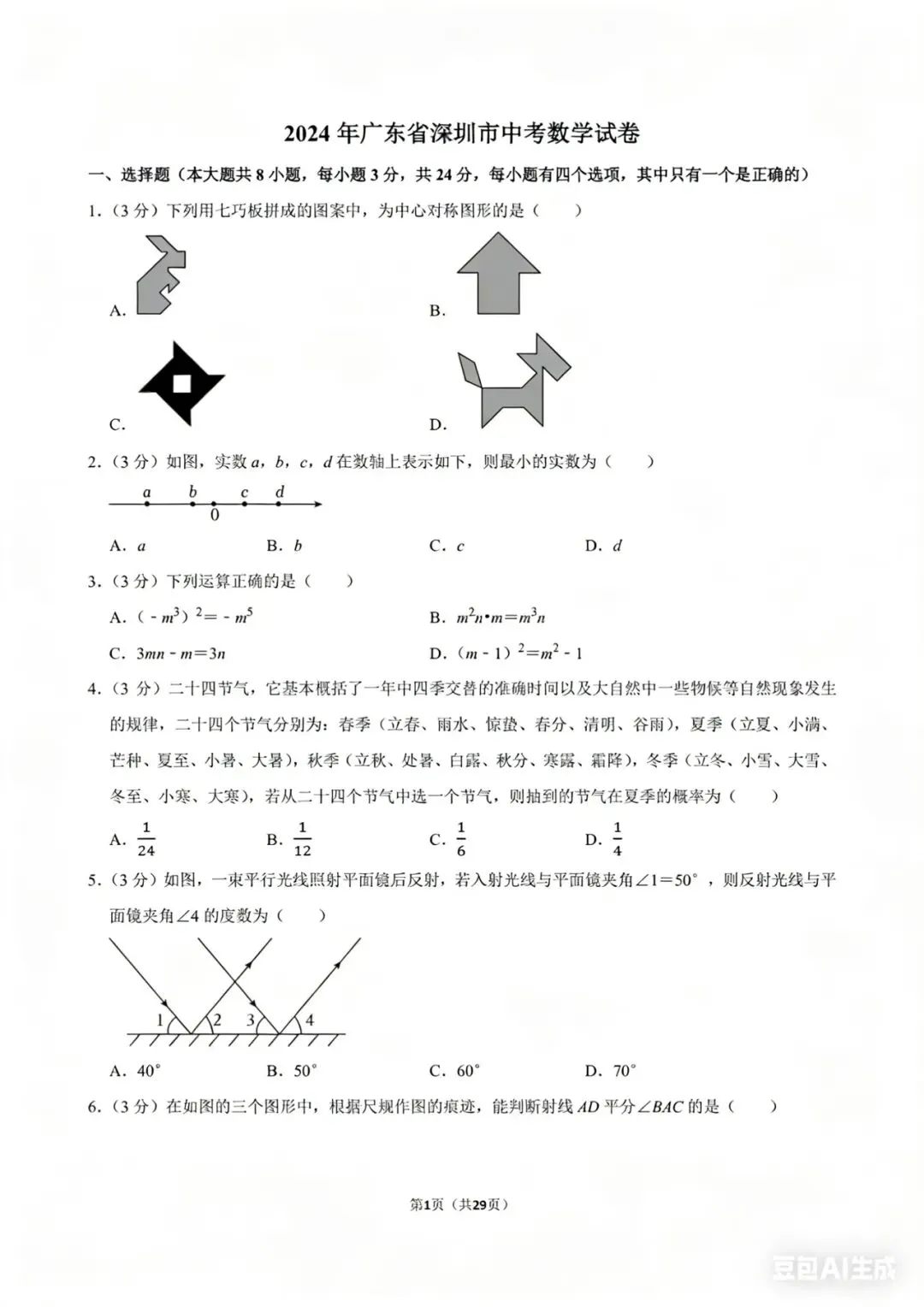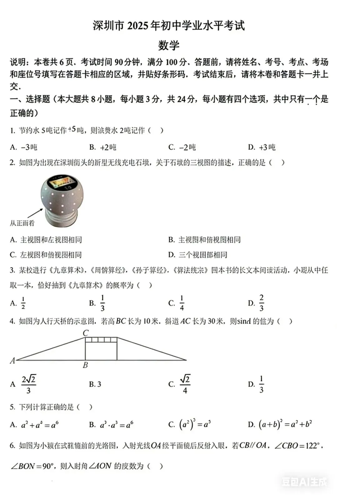 深圳中考数学满分100分,考试时间90分钟,整体呈现“基础打底、能力分层、情境创新、素养导向”的鲜明特点,我们结合真题逐一拆解: