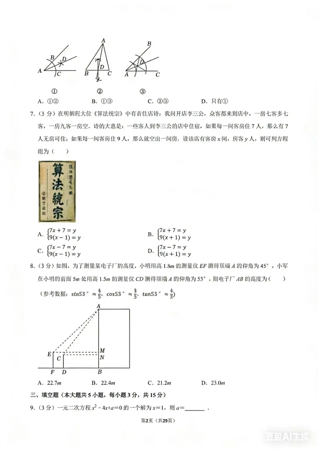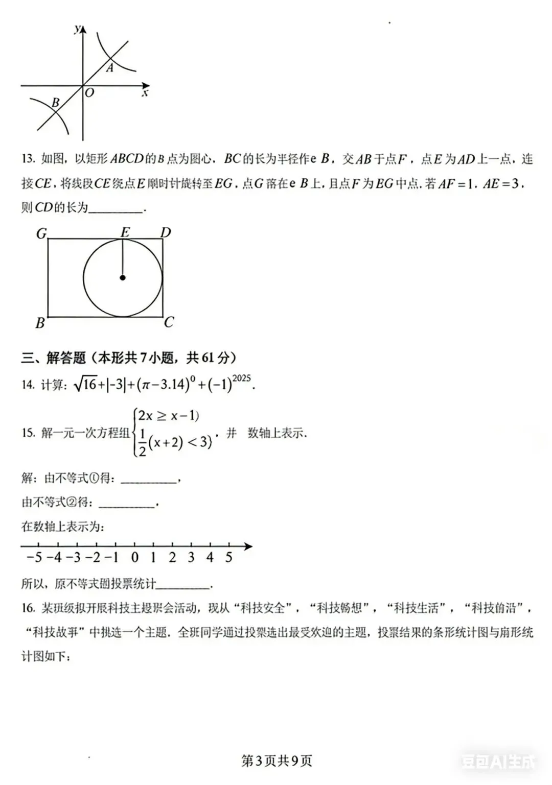 • 解答题:7题,61分,易→难,基础计算、统计、方程函数、几何证明、压轴探究