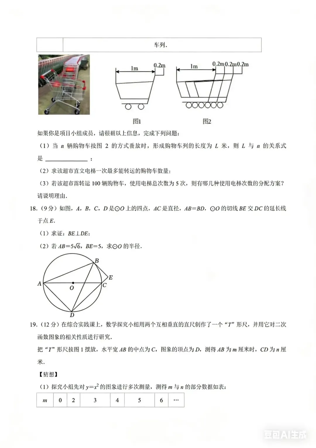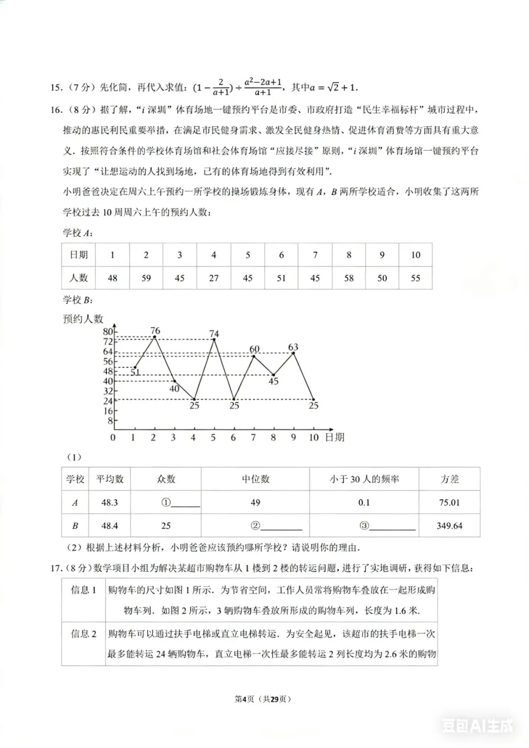 • 2025深圳中考第17题(购物车转运问题):以超市购物车为背景,建立一次函数模型,解决电梯转运的实际问题,考查一次函数的应用与不等式方案设计。