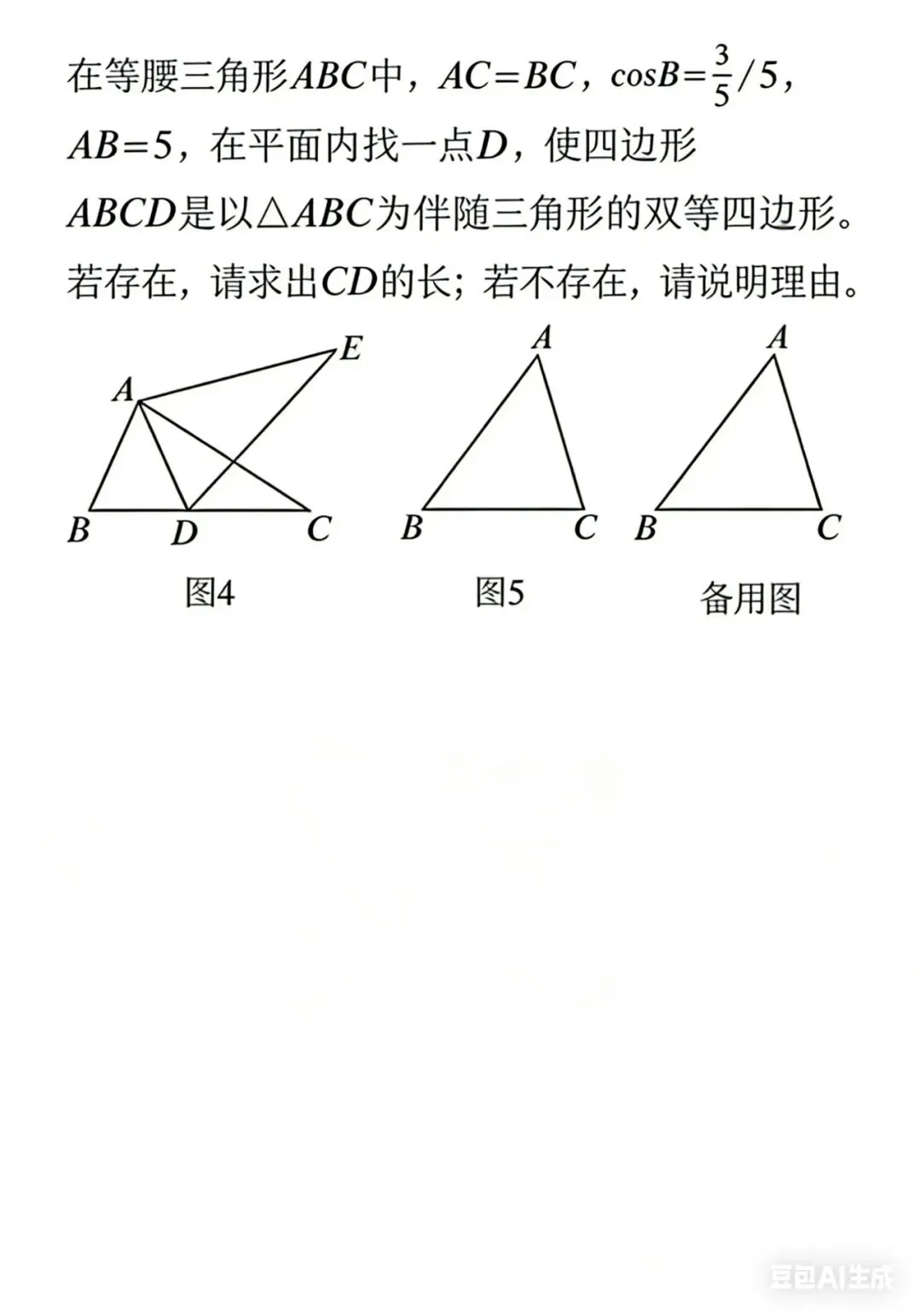 • ① 由AB=AC得∠B=∠ACB,由AD=CD得∠DAC=∠DCA,结合∠D=∠BAC,用三角形内角和证明∠DAC=∠ACB,从而得平行;
