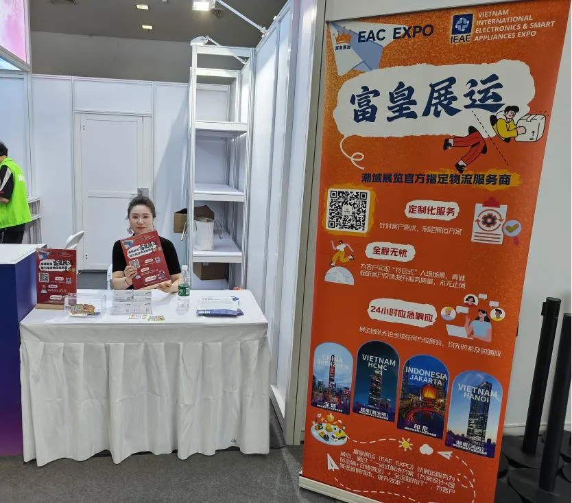 作为潮域展览官方指定物流服务商,富皇展运在8号馆服务台设立专属咨询展位,为现场展商及观众提供专业的展会物流解决方案。