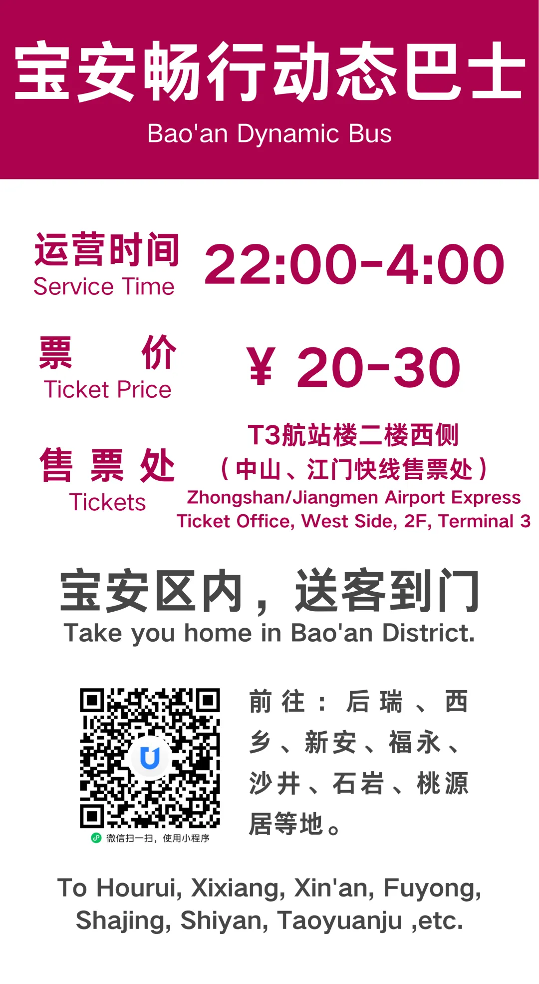 运营线路:可至南山、龙华、龙岗、坪山、光明、福田等地,夜间线路最晚运营直至航班结束。