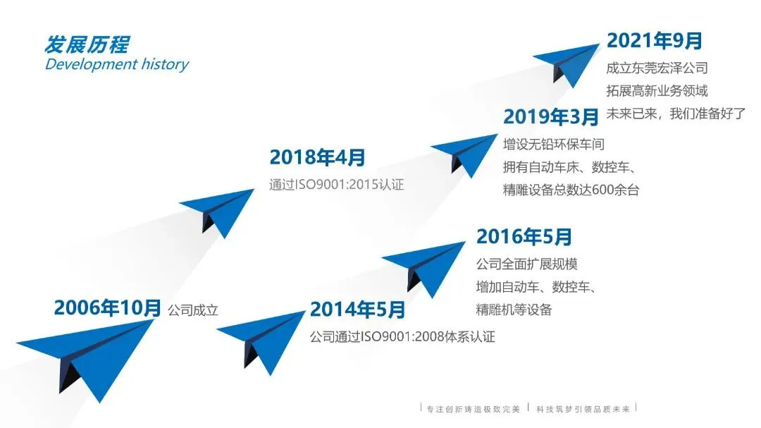 公司专注于精密五金制品、五金配件、机械设备及配件、电子产品配件的研发、生产与销售,为众多客户提供高品质、高精度的五金零部件解决方案。公司经过多年的努力,已成为行业领军企业,2021年公司投资成立东莞市宏泽精密五金有限公司,拓展高新业务领域,建造十万级无尘车间。