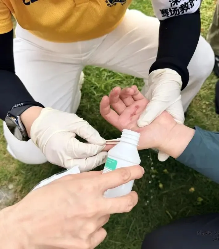 每当有跑者遇到困难——无论是不慎擦伤需要清创包扎、扭伤脚踝急需固定处理、肌肉痉挛亟待拉伸缓解,还是因体力消耗过大引发低血糖,面色苍白、头晕乏力地寻求帮助,队员都会第一时间上前,熟练开展伤情评估、肌肉放松、止血包扎、能力补给等应急处置,动作专业利落,语气温和耐心。