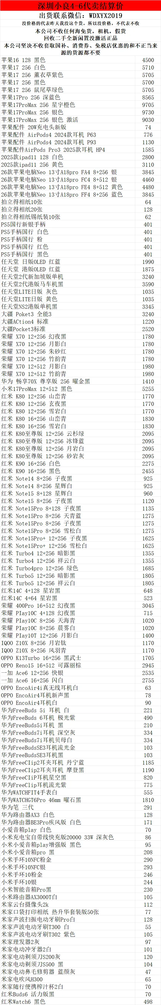 >深圳小良2026.4.6电子产品代卖结算价(美妆价格小程序查看)