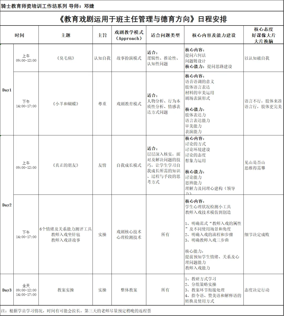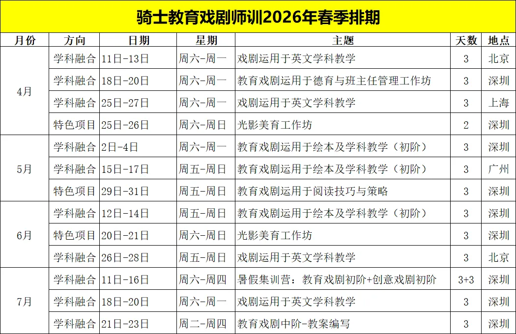 从2012年开始,骑士教育戏剧的创始人分别向香港、台湾、美国、英国、日本等10几位教育戏剧专家请进来学习,也走到这些国家去学习,同时教研团队也不断进行本土化教学实践。其中,把戏剧教学手法运用于学生品格养成、班级文化建设、情感教育及冲突解决等方面,是近年来最受班主任欢迎的研究方向之一。结合教育戏剧方法、儿童心理学、班级经营策略等领域,经过多年实践与打磨,形成契合国内学校班主任实际工作场景,提升教师思维与问题解决能力的师资培训。