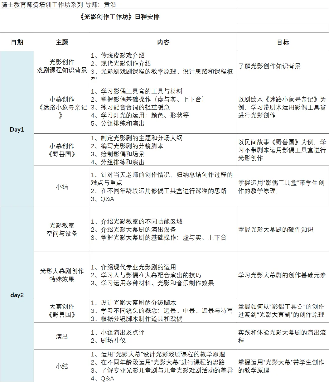《光影美育工作坊》两天日程安排1、幼儿园、小学、中学老师;