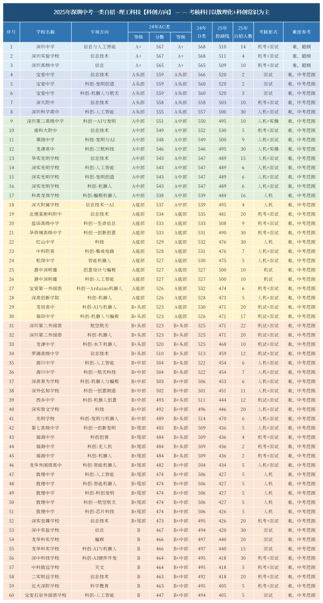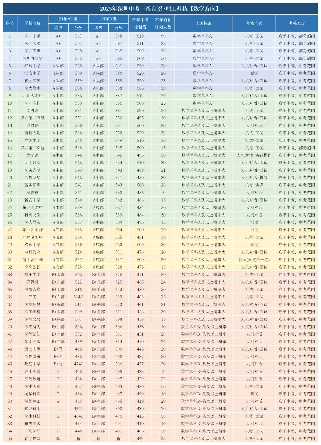 ▲一线重点(红岭、宝中、深大附中等):要求中考单科等级在A头部,校考难度基本在“中考范围”内但强调思维深度,考核形式多样(面试、人机对话等)。