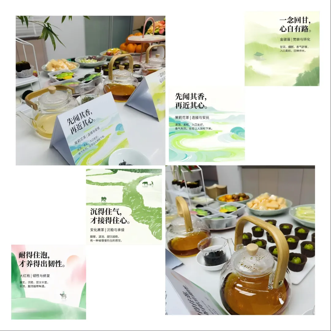 金骏眉代表"觉察与转化",茉莉花茶代表"连接与安抚",安化黑茶代表"沉稳与承接",大红袍代表"韧性与修复"。