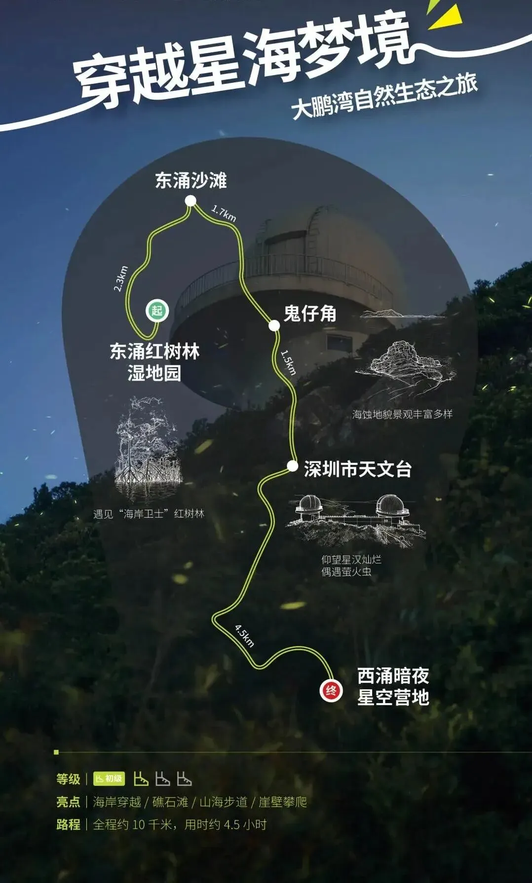 在深圳东南部,有一片充满活力的山海。这条位于大鹏半岛的10公里初级路线,将带您穿越“中国最美海岸线”之一的东西涌。从东涌红树林湿地园出发,邂逅“海岸卫士”红树林与它的“虾兵蟹将”;沿礁石滩与山崖前行,欣赏海蚀平台、海蚀洞等奇特地貌;夜幕降临时,走进中国首个国际暗夜社区,在深圳市天文台旁仰望星河,幸运的话还能遇见萤火虫点亮夜空。