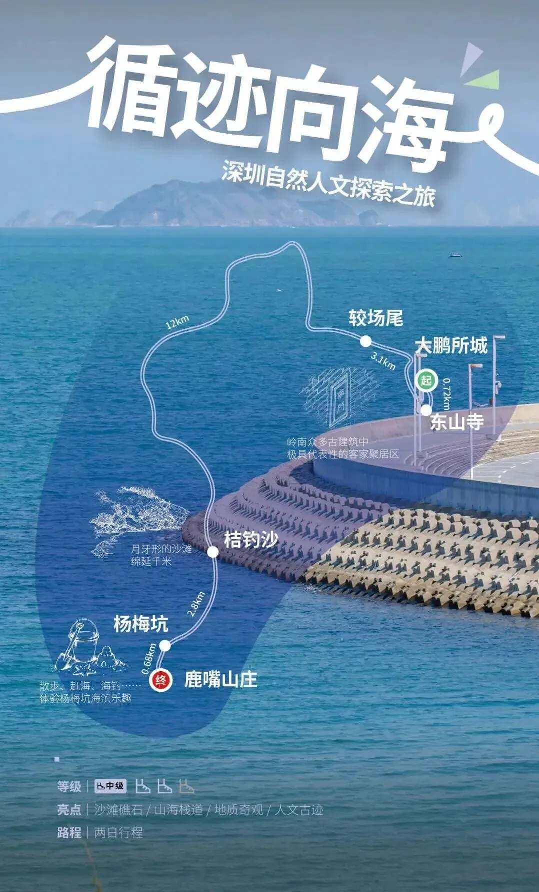深圳,中国内地离海最近的一线城市。这条需时两日的中级路线,将带您沿着山海生态线,走进一段“鹏城回忆录”。从大鹏所城出发,在振威将军第的砖瓦间感受“三代五将”的家国情怀;漫步较场尾沙滩,欣赏浪漫日落。次日深入桔钓沙与杨梅坑,邂逅“玻璃海”的清澈,体验海钓的乐趣;最终抵达鹿嘴山庄,打卡因海蚀作用形成的“人鱼洞”。