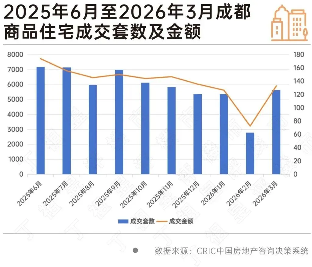 而成都市场3月新房当月累计成交约5641套,成交面积约73.97万平方米,成交金额约134.7亿元,环比分别上涨101.9%、93.98%和83.04%。