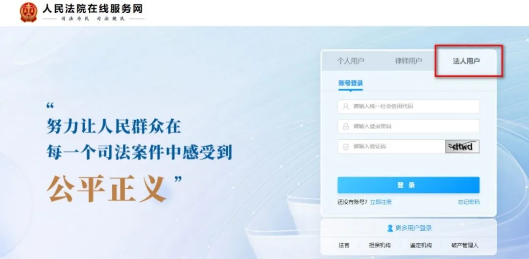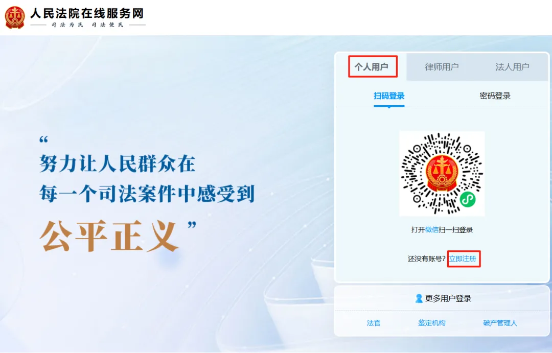打开浏览器,在地址栏输入:https://zxfw.court.gov.cn/,进入人民法院在线服务网登录页面。个人请选择“个人用户”,律师请选择“律师用户”,法人建议选择“法人用户”注册登录。