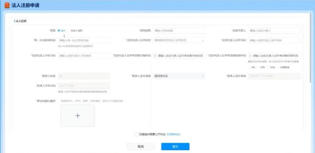 用手机微信扫码后,按提示进行个人信息填写和人脸识别,识别成功后电脑端会自动打开法人账号注册信息填写页面。法人要如实填写基本信息,并上传营业执照扫描件,目前扫描件支持四种图片格式,文件大小不超过 20M。
