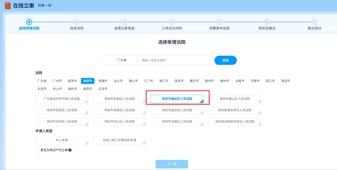 进入选择受理法院界面。选择有管辖权的人民法院,根据实际情况选择本人申请/为他人或公司等组织申请,勾选完后点击下一步。