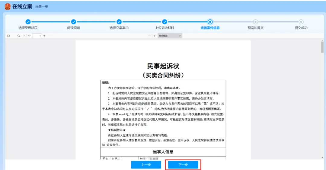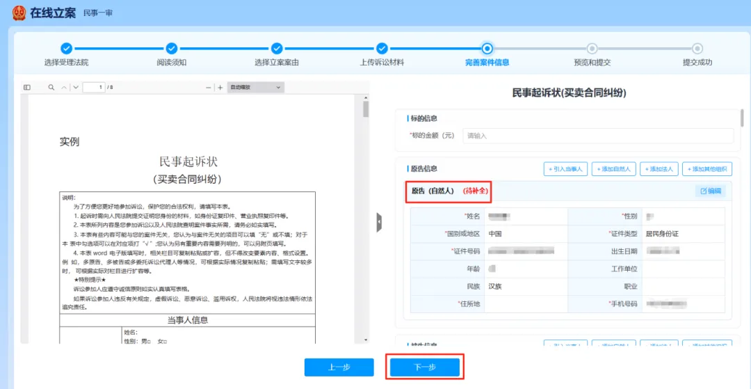进入完善案件信息界面。可以先学习要素式民事起诉状示范样本,依次补充起诉状信息,注意带红星的是必填项;填写完毕后应认真核查,确认无误点击下一步。