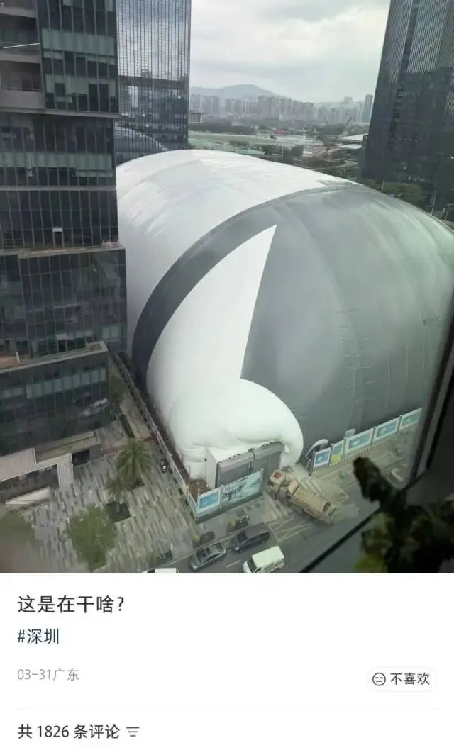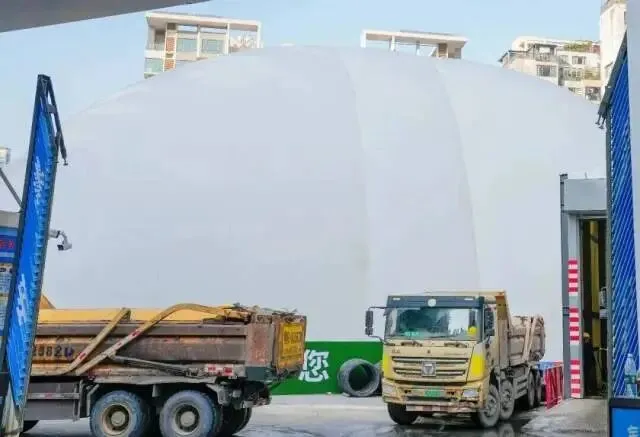 由于项目地处车公庙核心地段,紧邻密集居民区、高层写字楼与繁华步行街,同时毗邻地铁7/9号线,对施工降噪、降尘、控振要求极为严苛。如果是开放施工,周边会受到干扰,气膜=隔音罩+防尘罩,可挡住噪音和粉尘,气膜利用内外气压差实现膨胀和支撑。